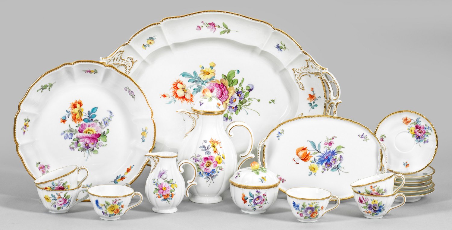 für sechs Personen. 12-tlg.; Mokkakanne, Zuckerdose, Sahnegießer, 6 Tassen mit Untertassen, Tablett, Konfektschale, Anbietplatte. Form "Rokoko" mit mehrfach eingezogener Wandung. Farbenprächtiger Dekor aus Blumenbuketts und Streublumen in feiner polychromer Malerei. Goldzahnkante. Manufakturmarke. Kannen-H. 19 cm. Anbietplatten-L. 44 cm.
