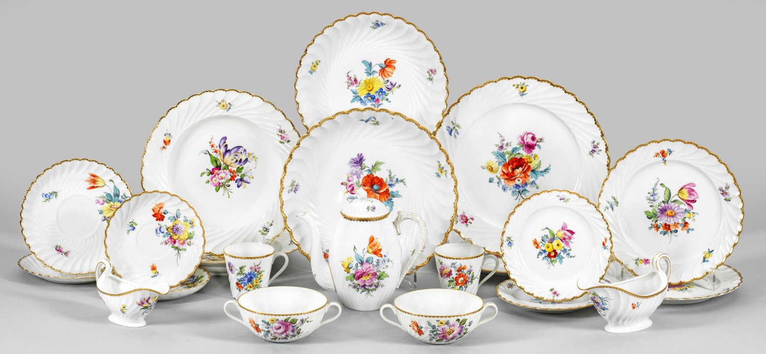 für 2 Personen. 17-tlg.; Kaffeekanne, 2 Kaffee- und 2 Suppentassen mit Untertassen, 2 Dessert-, 2 Brot-, 2 Suppen-, 2 Speiseteller, 2 Anbietschalen, 2 Saucieren. Schräg gerippte Wandung mit farbenprächtigen Blumenbuketts und vereinzelten, gestreuten Blüten in polychromer Malerei. Umlaufender Goldornamentrand. Manufakturmarke. Kannen-H. 17 cm. Schalen-D. 26 cm.
