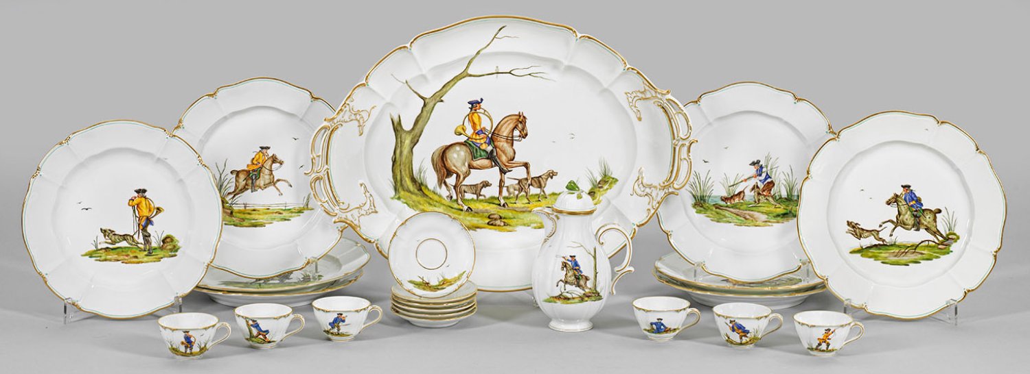 16-tlg.; Große Anbietplatte, 8 Speiseteller, Mokkakanne und 6 Mokkatassen mit Untertassen. Form "Rokoko" mit fassoniertem, in Gold und Seegrün staffiertem Rand. Auf der Wandung und im Spiegel verschiedene, jagdliche Motive im sog. Inselstil. Szenische, teilw. an Ufern gelegene Landschaftsdarstellungen mit Jägern in Rokoko-Kleidung, zumeist in Begleitung von Hunden, zu Pferd sitzend sowie bei der Rast und ausgestattet mit Jagdhorn. Dekor-Entw. Hans Kratzer, ab 1910. Manufakturmarke. Platten-D. 36 cm - 50,5 cm.