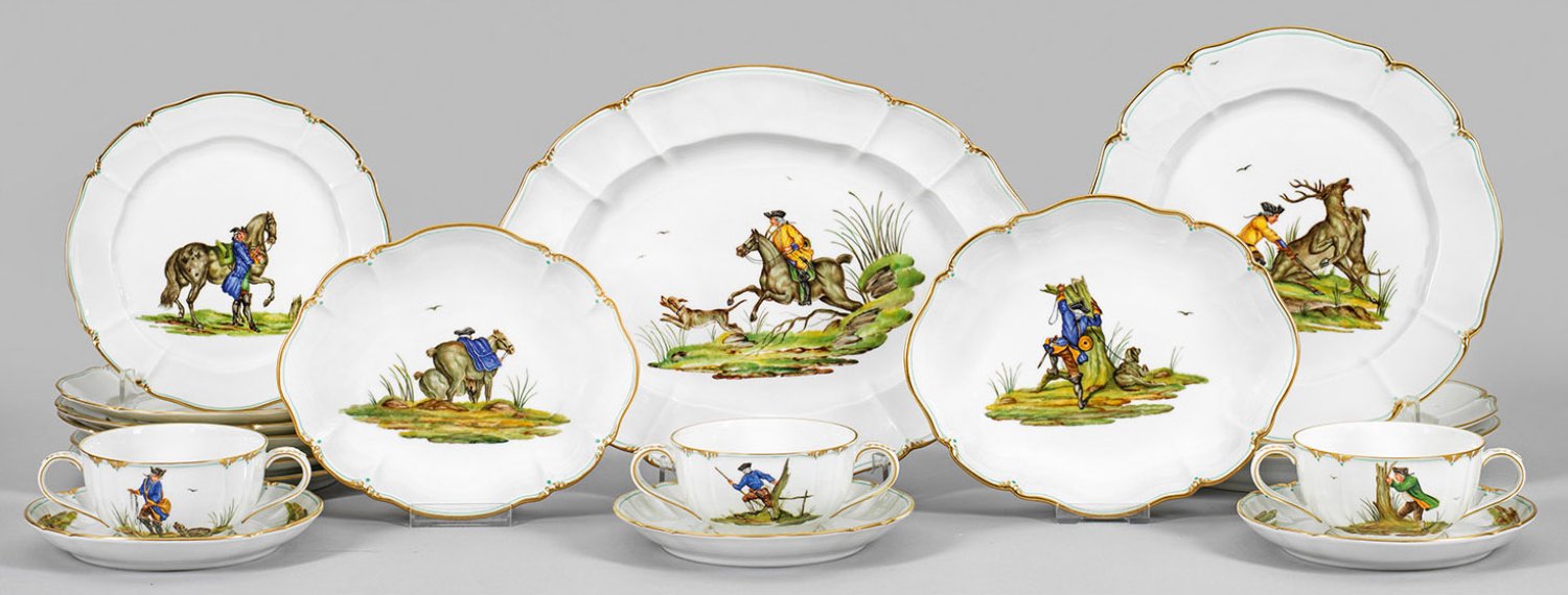 für 3 Personen. 15-tlg.; Anbietplatte, 2 Beilagenschalen, 3 Vorspeisen-, 3 Speise-, 3 Dessertteller, 3 Suppentassen mit Untertassen. Form "Rokoko" mit fassoniertem, in Gold und Seegrün staffiertem Rand. Auf der Wandung und im Spiegel verschiedene, jagdliche Motive im sog. Inselstil. Dekor-Entw. Hans Kratzer, ab 1910. Manufakturmarke. Platten-L. 33,5 cm.