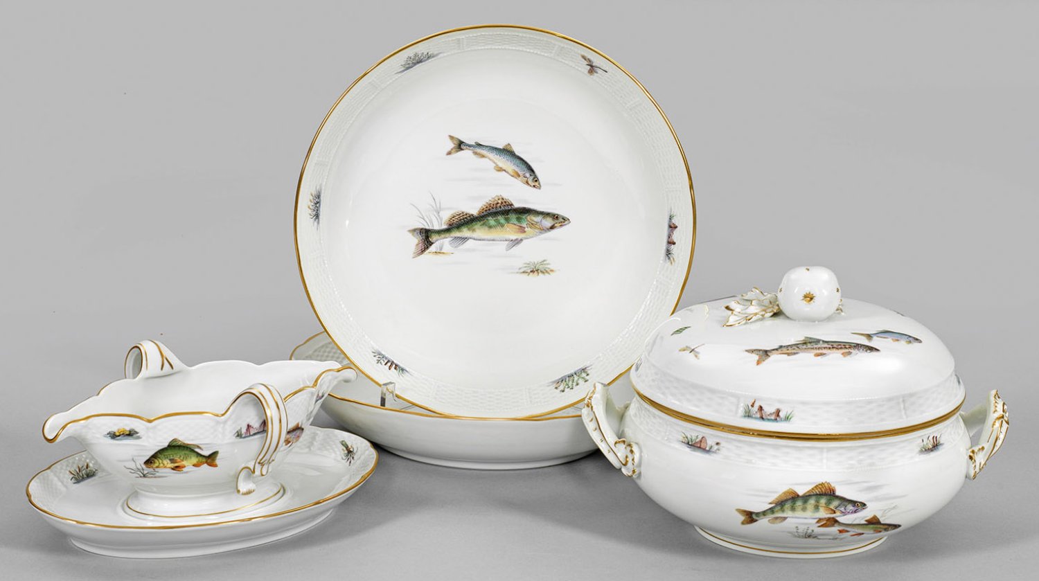 für 2 Personen. 4-tlg.; Suppenterrine, Sauciere, 2 große Suppenteller. Runde Form mit fassoniertem Rand. Ozierrelief. Im vertieften Spiegel, auf den Wandungen und dem Deckel naturalistische Darstellungen verschiedener Fischarten, u. a. Zander, Seeforelle, Tiefseesaibling, Salmling, Steinforelle, Barsch, Karpfen, Rotauge und Karausche, auf der Fahne Wasserpflanzen- und Insektenmotive in feiner polychromer Malerei. Goldrand. Rücks. Bez. der Fischarten. Terrinen-H. 16 cm, Teller-D. 26 cm.