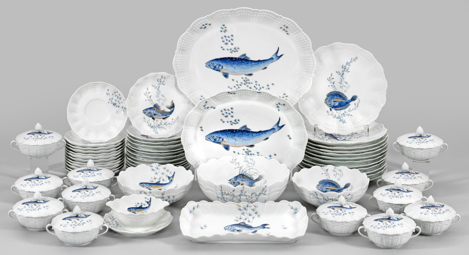 44-tlg.; 12 Speise-, 13 Brotteller, 12 Suppentassen mit Untertassen, 3 Beilagenschalen, Sauciere, 3 Fischplatten. Muschelförmig gerippte Wandung. Verschiedene Fischmotive in dezenter polychromer, goldgehöhter Malerei. Teilw. minim. best.; Manufakturmarke. Plattenmaße 39 cm x 31 cm.