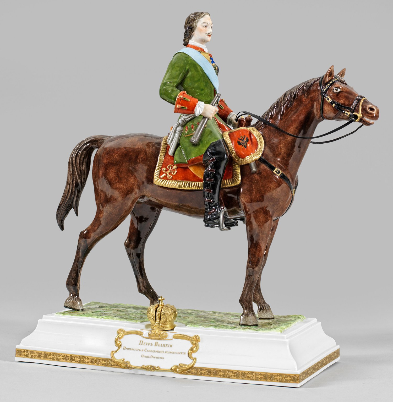 Über naturalistischem Terrain, zu Pferd sitzender Peter I., Zar und Großfürst von Russland und erster Kaiser des Russischen Reiches, in grüner Uniform mit Orden und Ordensband des Heiligen Andreas. Auf der Satteltasche der russische Doppeladler mit Zepter und Reichsapfel als Wappen. Profilierter Rechtecksockel mit umlaufender Ornamentbordüre. Schauseitig die plastische, vergoldete Zarenkrone über rocaillegerahmter Reserve mit russischer Inschrift "Peter der Große Imperator (...)", rücks. das reliefierte Monogramm Peter des Großen. Polychrome Malerei mit Goldstaffage. Kunstlederzügel. Unterglasurblaue Manufakturmarke mit Zusatz "rusz". H. 42 cm.