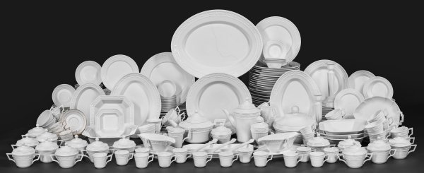 für 12 Personen. 215-tlg.; Kaffee-, Teekanne, Sahnegießer, Zuckerdose, 18 Kaffeetassen mit 13 Untertassen, 12 Tee-, 17 Mokkatassen mit Untertassen, 13 Platz-, 32 Speise-, 12 Suppen-, 12 Brot-, 25 Dessertteller, 14 Suppentassen mit Untertassen, Suppenterrine, 4 Bratenplatten, 6 Anbiet-, 3 Blatt-, 4 Zucker-, 16 Kompottschalen, 2 Saucieren, Tablett, Anbietteller, 12 Konfektschälchen, 3 Saucenlöffel, 2 Kerzenleuchter, Teedose. Weißporzellan. Reliefdekor "Kurland". Größte Bratenplatte rest., 1 Saucenlöffel best.; Beigabe: 5 Mokkatassen mit 6 Untertassen, Reliefdekor "Kurland", Goldrand und Schokoladentasse mit Untertasse. Zeptermarke. Kerzenleuchter-H. 21,5 cm. Plattenmaße 27 cm - 46,5 cm.