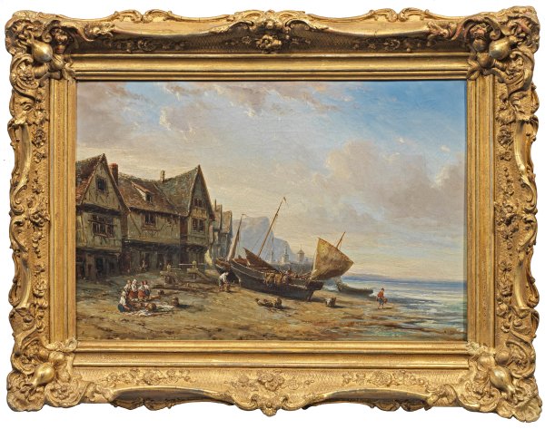 Durch eine lebendig geschilderte Figurenstaffage belebte Ansicht mit effektvoller Wiedergabe der Lichtstimmung. Der in Brest und Paris ausgebildete Maler debütierte 1836 auf dem Salon und nahm 1840-1879 regelmäßig an Ausstellungen teil. Noël schilderte mit Vorliebe Veduten, Landschaften und Marinemotive aus der Bretagne und Normandie. Öl/Lwd.; 43 cm x 65 cm. Rahmen.