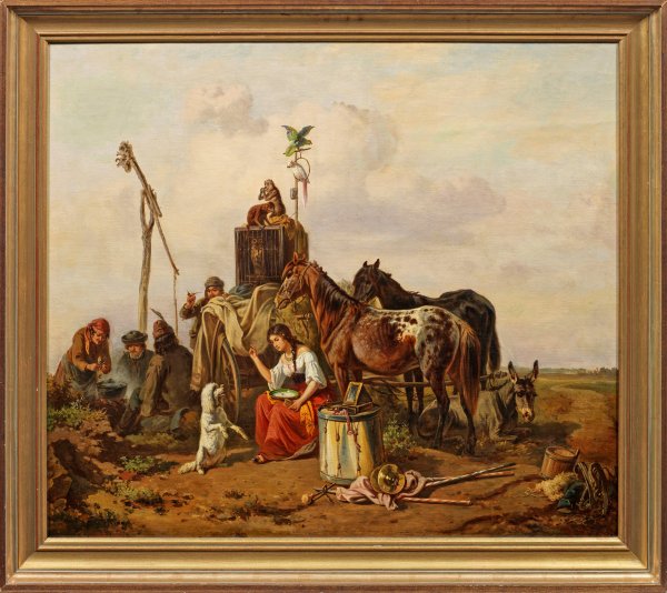 Pittoreske Szene der an einem Ziehbrunnen rastenden, über die Dörfer ziehenden Wanderzirkus-Gruppe mit zweirädrigem Karren. Im Bildmittelpunkt dressiert ein sitzendes Mädchen in leuchtend rotem Rock einen weißen Pudel, während auf der linken Bildseite eine Frau am Lagerfeuer das Essen für zwei junge Männer zubereitet. Als Tiere werden auf der rechten Bildseite zwei Pferde und ein ruhender Esel geschildert, auf dem Karren ein Uhu im Käfig, zwei tummelnde kleine Affen, ein weißer Kakadu und ein bunter Papagei. Das Gemälde zeigt eine für die Kunst des 19. Jhs. zeittypische romantisierende, stimmungsvolle Darstellung des fahrenden Volkes, wie sie in vergleichbarer Weise auch von vielen österreichischen und ungarischen Malern, darunter György Vastagh (1834 - 1922) und Mihály von Munkácsy (1844 - 1900), geschildert wurde. Öl/Lwd.; R. u. undeutl. sign.; 88 cm x 105,5 cm. Rahmen.