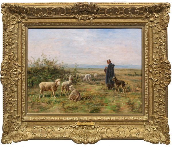 Morgendlich gestimmte, in hellem, pastelltonigem Kolorit gemalte, impressiv aufgefasste Darstellung. Charpin, ein Schüler von Charles-François Daubigny gehörte zur Schule von Barbizon. Mit Vorliebe malte er ohne Idealisierung Menschen im selbstverständlichen Einklang mit den Tieren und der Natur in ursprünglich wirkenden Landschaften, oft mit einer Hirtin und ihrem Schutzhund. Öl/Lwd.; L. u. sign.; 39 cm x 55,5 cm. Original-Rahmen. Plakette mit Künstler-Bez. u. Inschrift "Hors Concours".