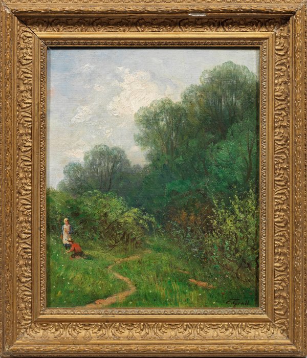 Stimmungsvolle Landschaftsimpression Grolls, der sich als Schüler Caspar Scheurens der Veduten- und Landschaftsmalerei zuwandte. Öl/Lwd., kaschiert auf Karton. R. u. sign.; Verso bez./betitelt "Aus dem Ziegelbusch b. D. (/) 'am Waldrand'". 38 cm x 31,5 cm. Rahmen.