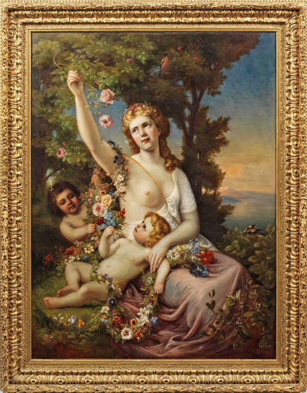 Darstellung der in einer arkadischen Landschaft ruhenden Göttin Flora als Halbakt mit Blumengirlanden und Rosen, begleitet von zwei Putti. Großformatiges, von Hans Makart und Hans Zatzka beeinflusstes Gemälde. Öl/Lwd.; R. u. sign.; Ein Riss über dem linken, hinteren Putto. 151 cm x 118 cm. Prunkrahmen.