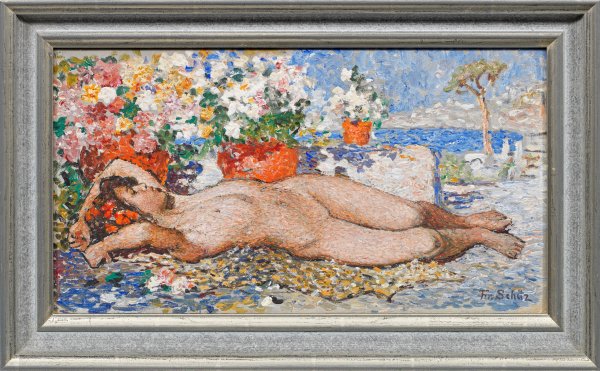 Auf einer mediterranen, am Ufer gelegenen Terrasse mit zahlreichen, bunt blühenden Pflanzen, ein auf einer Decke liegender, weiblicher Akt. In leuchtenden Farben, impressionistisch dynamisch und pastos gemaltes Werk des Sohnes von Theodor Schüz und Bruder des Hans Schüz. Öl/Papier oder Karton. R. u. sign. Darstellung 21,3 cm x 39,8 cm. Rahmen.