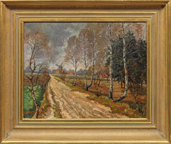Stimmungsvoll inszenierte, impressionistisch aufgefasste Herbstlandschaft mit Windmühle. Öl/Karton. L. u. sign.; Verso bez.; 36,5 cm x 45,5 cm. Rahmen.