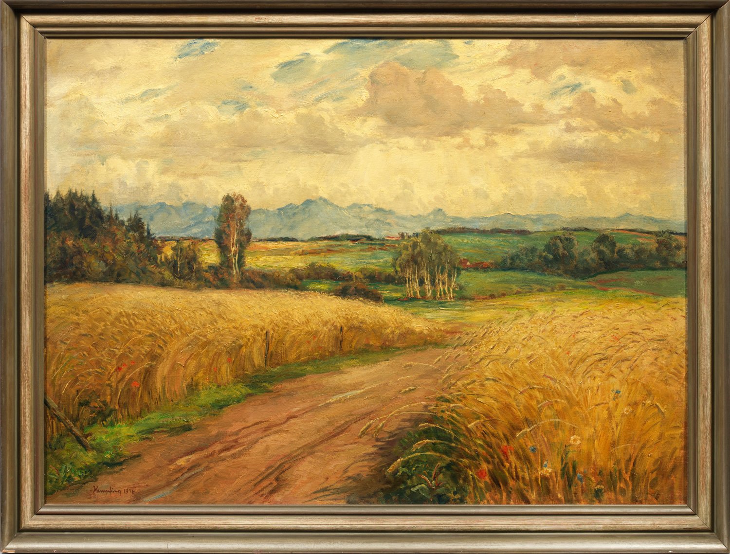 Stimmungslandschaft des Spätimpressionisten, der Meisterschüler an der Karlsruher Kunstakademie bei Friedrich Fehr war. Er unternahm Studienreisen nach Südeuropa (Balkan, Italien, Spanien), Nordafrika, die Bretagne, Dänemark, England und insbesondere an die norddeutschen und ostpreußischen Küsten (Sylt, Samland, Rügen und Usedom). Er zeigte seine Gemälde u. a. im Glaspalast in München, im Künstlerhaus in Wien und auf der Großen Kunstausstellung in Berlin. Öl/Lwd.; L. u. sign. u. dat. 1946. 80 cm x 100 cm. Rahmen.