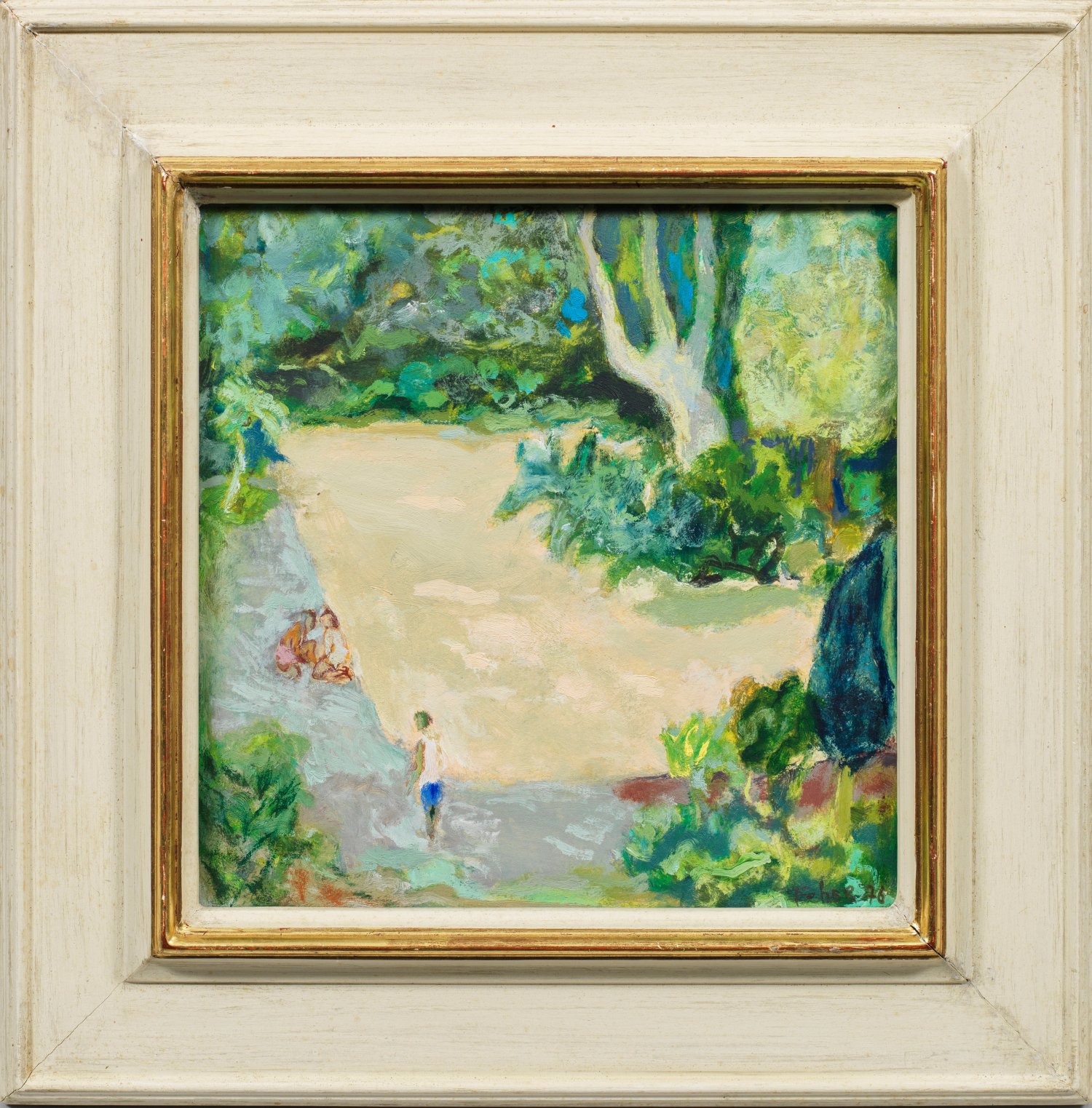 Postimpressionistisches Werk des ungarisch-französischen Malers, der bei István Szonyi in Budapest studierte und seit 1954 in Frankreich lebte. Nach einer kurzen abstrakten Phase wandte sich Feher 1957 wieder der Figuration zu, 1959 hatte er seine erste Einzelausstellung in Paris. Viele Gemälde entstanden in Südfrankreich und auf Ibiza. Öl/Hartfaser. R. u. sign. u. dat. (19)76. 21 cm x 20 cm. Rahmen.