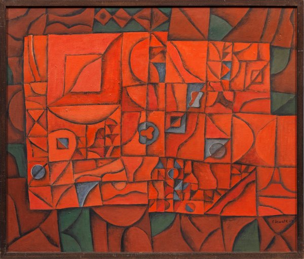 In reduzierter Farbigkeit und ornamental-geometrischer Abstraktion angelegte Komposition Dewalds, die Anleihen aus Werken Paul Klees erkennen lässt, unter dessen Einfluss Dewald ab den 1960er Jahren steht. Öl/Lwd.; R. u. sign. u. dat. (19)77. Verso auf einem Ausstellungsetikett bez.; 73 cm x 87 cm. Rahmen.