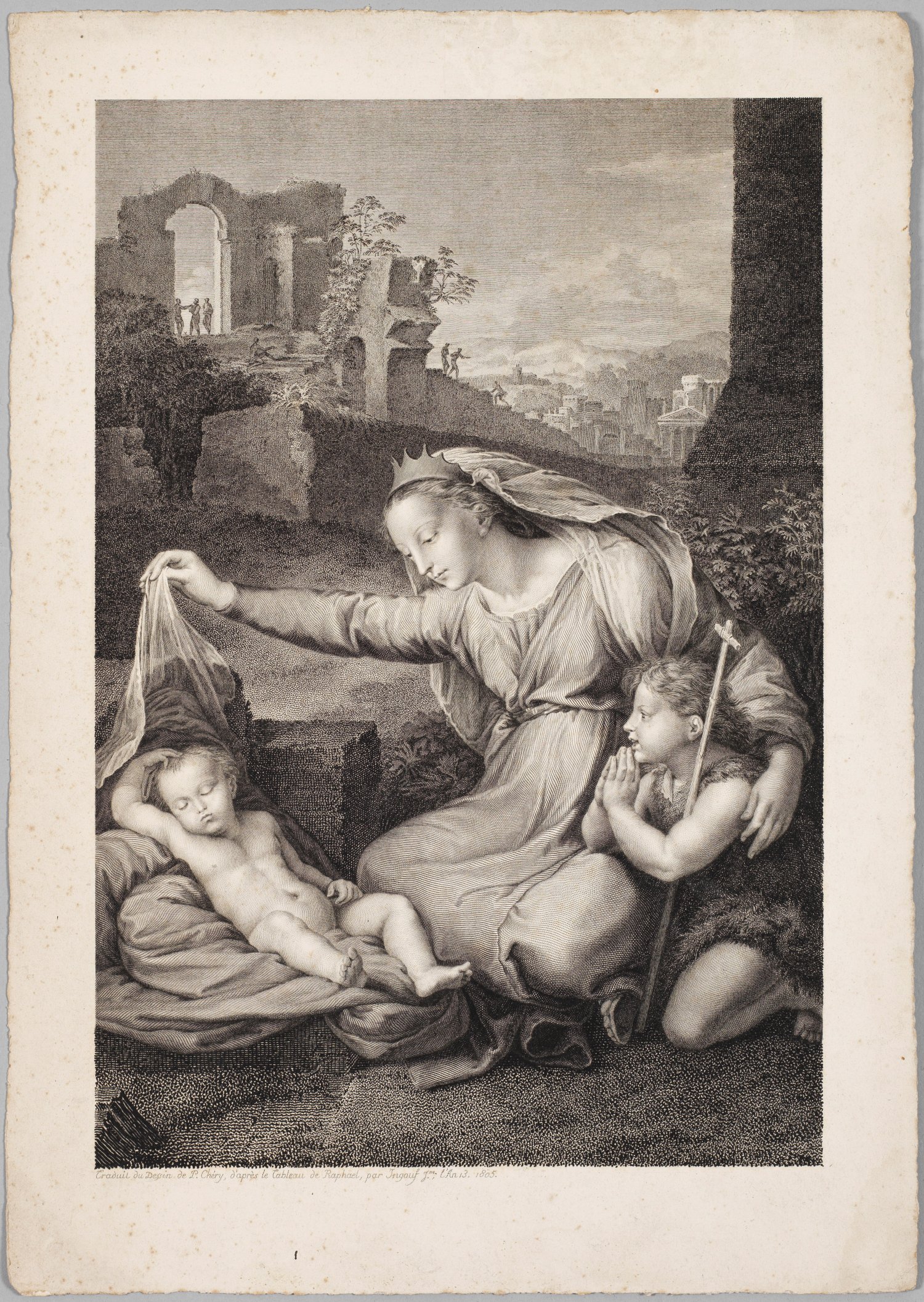 Copper engraving on paper, 1805. Drawn by Philippe Chéry (1759 - 1838) after the painting by Raphael (1483 - 1520), engraved by François-Robert Ingouf (1747-1812). Inscribed "La Vierge au linge" on the reverse.