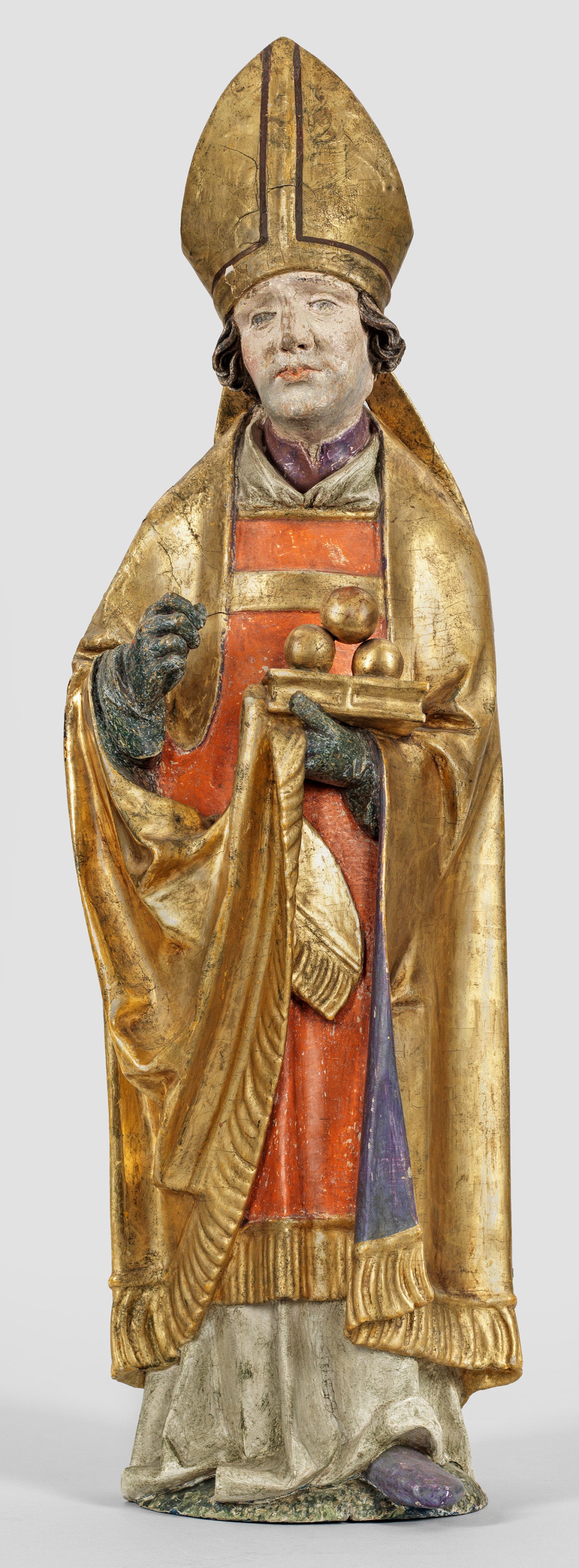 Lindenholz, geschnitzt, rücks. abgeflacht und ausgehöhlt, partiell alte bzw. originale Fassung und Vergoldung. Die reliefplastische Skulptur stellt Nikolaus im Bischofsornat mit Mitra und goldener Pluviale dar. Nikolaus steht im prononcierten Kontrapost, den Kopf leicht nach rechts ins Profil gerichtet. Mit seiner linken, behandschuhten Hand hält er den Saum der Pluviale und zugleich das Attribut der drei auf einem Buch liegenden goldenen Kugeln. Die eckig umbrechenden Falten des Gewands lassen auf eine Datierung um 1500-1530 schließen, die Behandlung des Kopfes mit der subtilen Modellierung des Gesichts zeigt Einflüsse von Tilman Riemenscheider, der mit seiner Werkstatt die Bildhauerei der Spätgotik in Franken maßgeblich prägte. H. 76 cm.