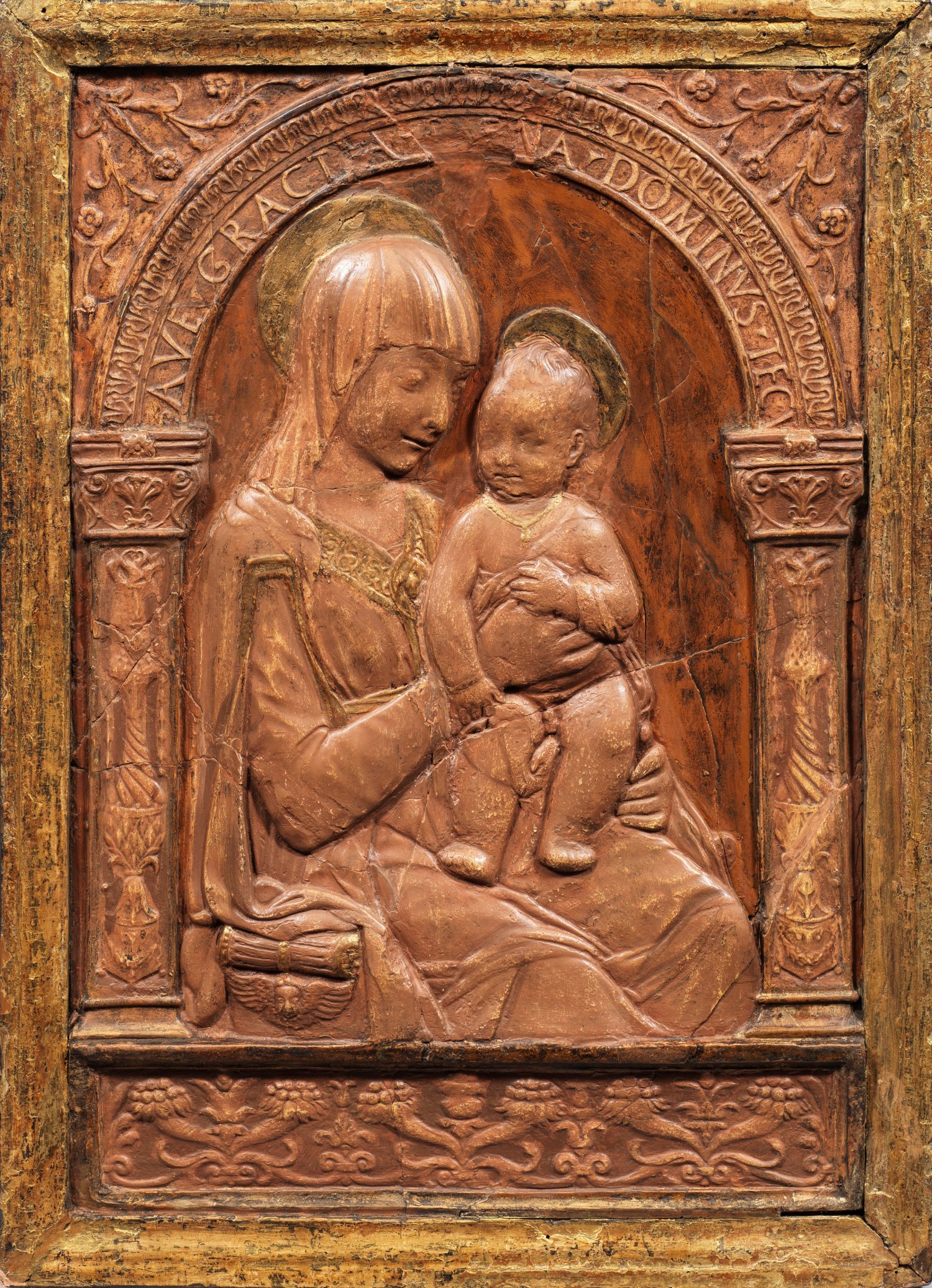 Stuckrelief, Fassung und Vergoldung übergangen; eingepasst in einen hölzernen, gefassten und vergoldeten Rahmen. Das erhaben ausgeführte Relief stellt die thronende Muttergottes mit dem Jesuskind dar, umgeben von einer architektonischen, ornamentierten Halbrundbogen-Rahmung. Die links sichtbare Thronlehne weist einen Engelskopf auf, das Kind trägt eine Kette am Hals und am Handgelenk. Im Bogen die lateinische, teilw. fragmentarische Inschrift in Versalien "AVE GRACT(IA PLE)NA DOMINUS TECV(M)"; in den Zwickeln und im Sockel unterhalb Renaissance-Ornamente mit Blütenranken und Füllhörnern. Das Relief entstand wohl Ende des 16. Jhs. oder im 17. Jh. nach einem unterschiedlich zugeschriebenen Modell von Antonio Rossellino oder Francesco di Simone Ferrucci, das in der Werkstatt Rossellinos und auch noch weit nach dessen Tod mehrfach in Terrakotta- und Stuck-Versionen unterschiedlichen Formats wiederholt wurde. Es gehört zu einer Gruppe bzw. Typus der sog. "Madonna vor der Girlande" im Bode-Museum in Berlin bzw. den "Versionen mit halbrundem Abschluss" (Vgl. Langhake, S. 432-425). Partiell best.; Rest.; Relief ca. 48,5 cm x 41 cm; Rahmen 67 cm x 48,5 cm.