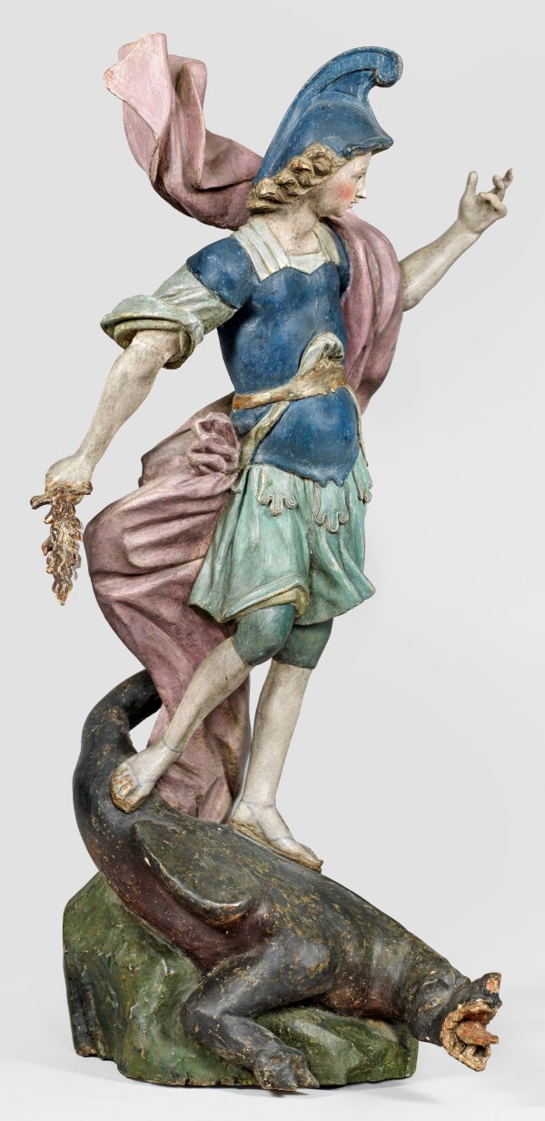 Holz, geschnitzt, Fassung übergangen. Vollplastische Darstellung des auf dem Drachen stehenden Erzengels, gewandet als römischer Soldat mit einem bewegt wehenden, über die linke Schulter gelegten Mantel, in der rechten Hand als Attribut ein flammendes Schwert haltend. Diese elegante Skulptur zeigt eine Affinität zur neapolitanischen Barock-Bewegung und insbesondere zum Oeuvre des Bildhauers Lorenzo Vaccaro (1655 - 1706), der eine Reihe von Versionen dieses Themas schuf. Hierzu zählt auch die bekannte, 1705 entstandene Holzskulptur des Hl. Michael, der den Teufel bzw. Luzifer besiegt, im Los Angeles County Museum of Art (Inv.-Nr. M.82.7), an der er mit Francesco Picano (1677 - 1743) zusammenarbeitete. H. 65 cm.
