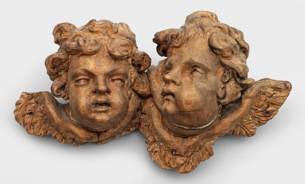 South German sculptor active 18th C.; Carved limewood sculpture with angel's heads. Flaws, stress cracks.