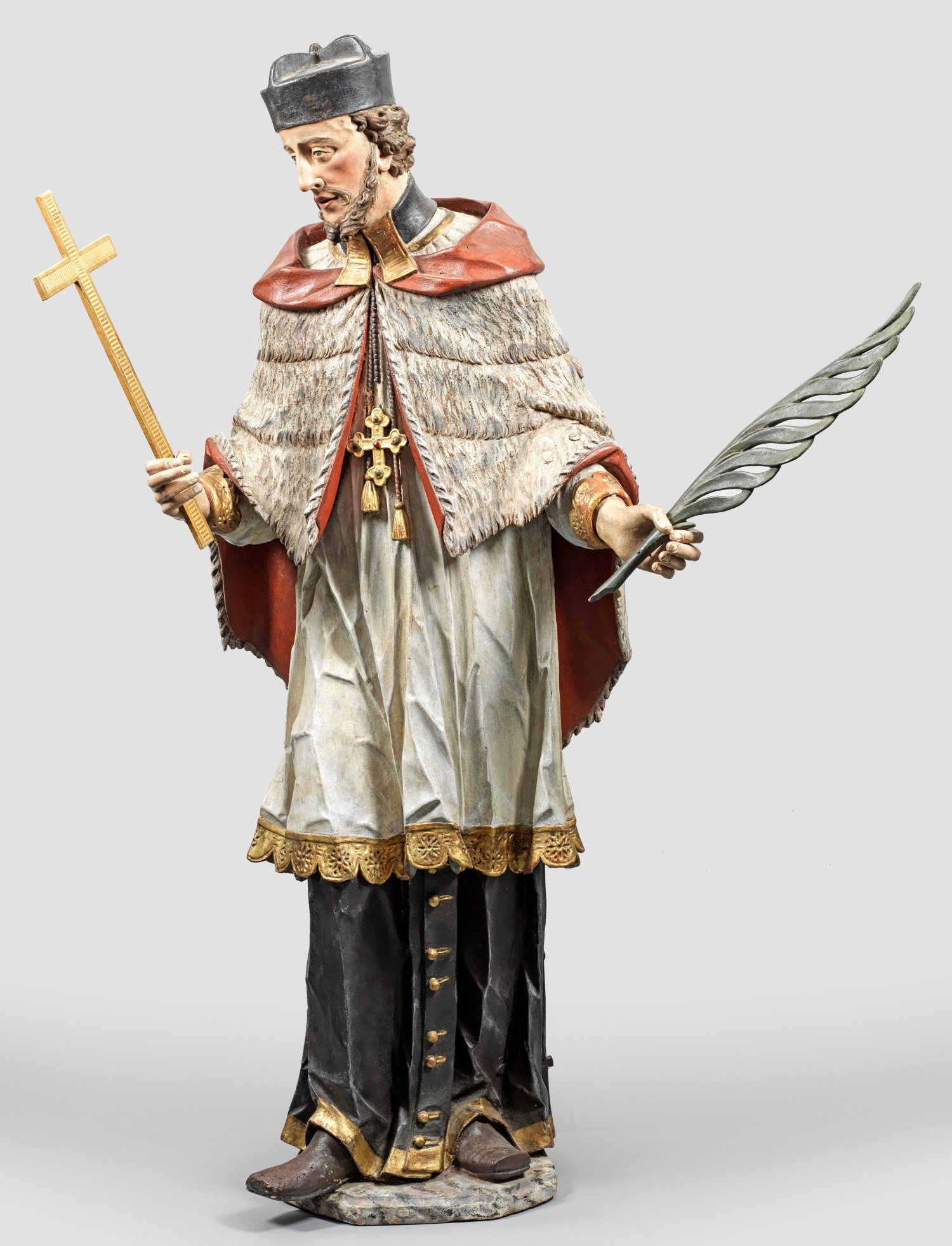 Lindenholz, geschnitzt u. gefasst, rücks. abgeflacht und ausgehöhlt; Fassung übergangen; Märtyrerpalme und Kreuz erg.; Große, fast vollplastische Darstellung des 1729 heiliggesprochenen, besonders in Böhmen und Österreich verehrten Brückenheiligen in priesterlichem Gewand mit Birett sowie Pelz-Mozetta und Kreuz-Schließe vor der Brust. In der lebendigen Bewegung der Figur, der subtilen Gestaltung des Blicks und den fein ausgearbeiteten Details von Bart, Chorhemd und Mozetta qualitätvolle Skulptur, welche in stiltypischer Weise die Bildhauerkunst des Spätbarocks und das Oeuvre Schwanthalers repräsentiert. Charakteristisch für diesen Bildschnitzer sind die scharf geschnittenen Falten der Gewandung, der leicht geöffnete Mund mit sichtbaren Zähnen, die besonders tief gearbeiteten Barthaare sowie die leicht schräg ausgeführten Augen. Johann Peter Schwanthaler der Ältere entstammte der bedeutenden Bildhauerdynastie, er war der dritte Sohn von Johann Franz Schwanthaler und ein Enkel von Thomas Schwanthaler. 1758/59 übernahm er die Schwanthaler-Werkstatt in Ried noch zu Lebzeiten seines Vaters und führte sie zu künstlerischem und wirtschaftlichem Erfolg. Außer Kirchenausstattungen führte er mit seiner Werkstatt zunehmend Einzelskulpturen aus, außerdem u. a. zahlreiche Kruzifixe und Kreuzigungsgruppen sowie Pietà-Darstellungen und Krippen. H. 154 cm.