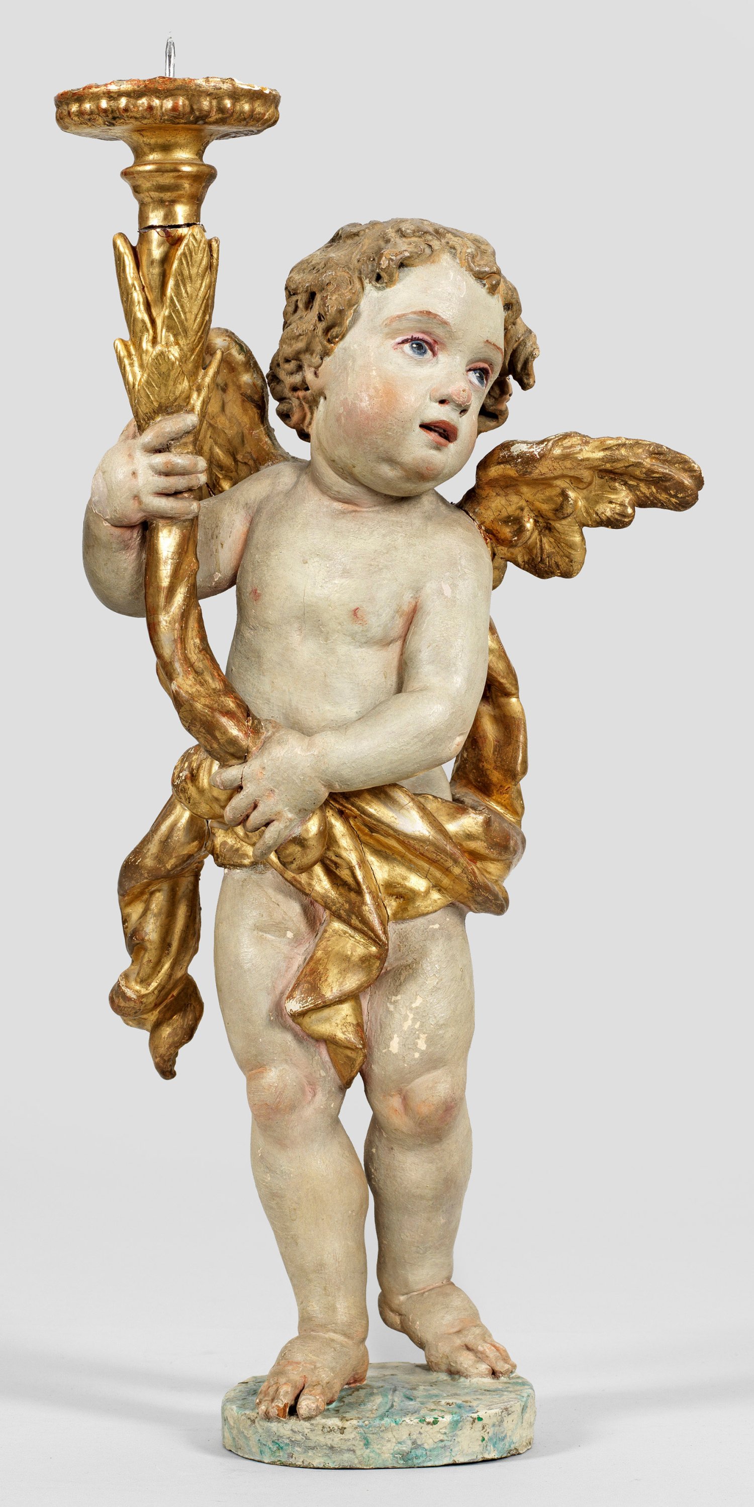 Lindenholz, geschnitzt, gefasst und vergoldet; Fassung übergangen. Vollplastische Darstellung. Auf einer runden Plinthe in dynamischer Pose stehender Engel mit kurzem, gelocktem Haar und um die Lenden und die Schulter gelegtem Tuch, der mit beiden Händen den mit Blättern belegten Schaft des Leuchters hält. H. 57 cm.