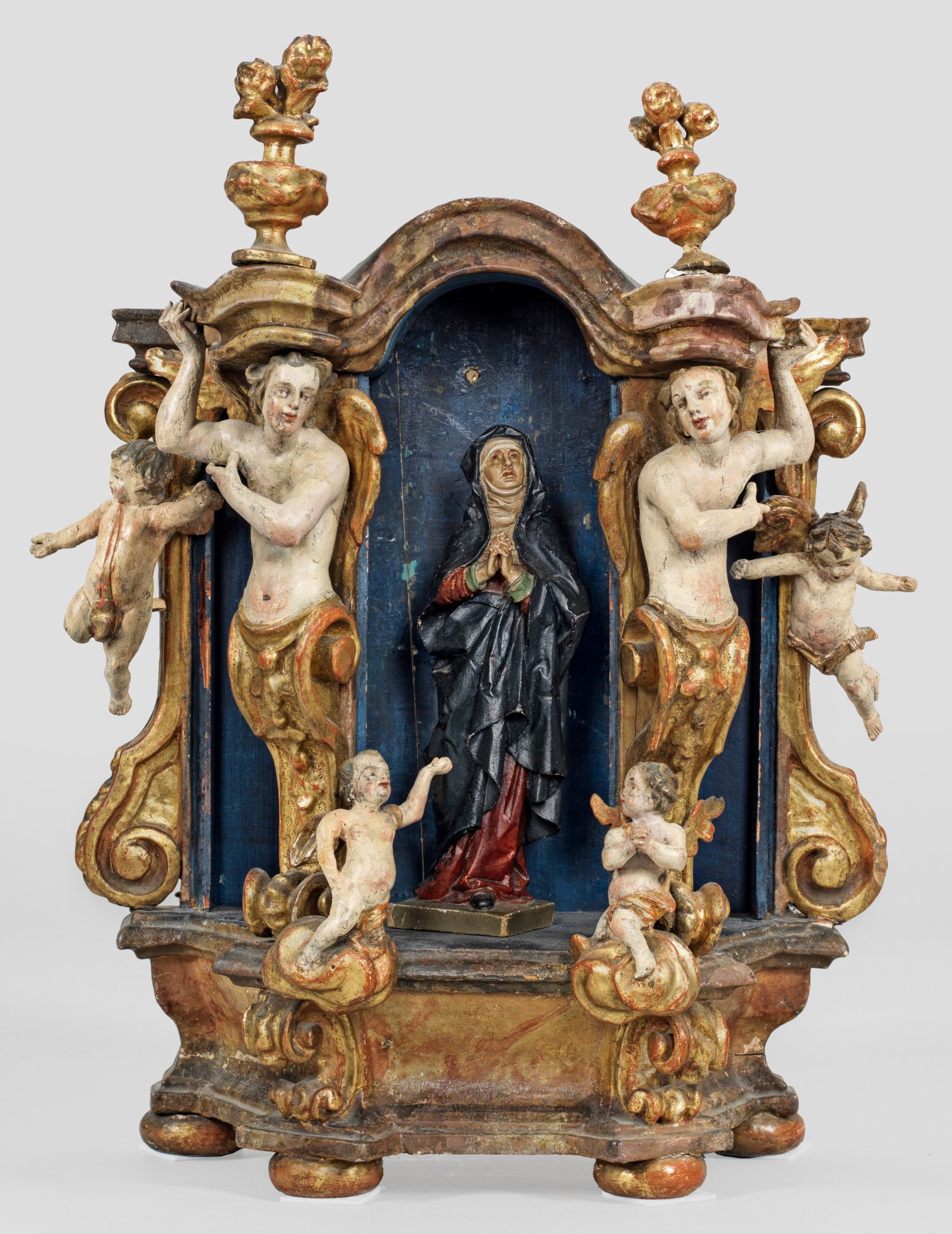 Holz, geschnitzt, gefasst und vergoldet. Wohl für einen Bischof oder anderen hohen Geistlichen ausgeführter Altar, gestaltet als zu drei Seiten geöffnetes Schränkchen mit Baldachin. An den vorderen beiden Ecken hermenartige Engel mit Volutenspangen, zu ihren Füßen jeweils auf Wolkensockeln kniende kleine Engel; die Wandseite von Volutenspangen und schwebenden Engeln flankiert; auf dem Baldachin zwei Vasenbekrönungen. Eingestellt eine kleine, gesonderte Statuette einer Mater Dolorosa. Ger. besch., Rückwand erg.; H. 49 cm; Figur der Mater Dolorosa H. 21,5 cm.