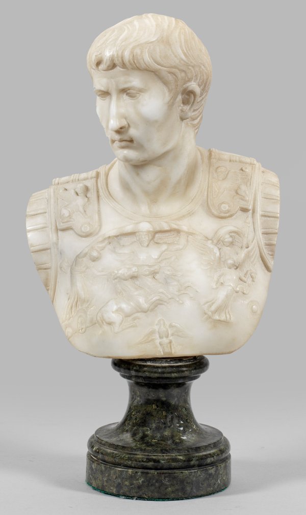 Weißer Marmor. Serpentinsockel. Repräsentativ gestaltete Büste des römischen Kaisers als siegreicher Feldherr mit leicht nach rechts gewandtem Kopf. Prunkvoller, mit allegorischen Figuren verzierter Brustpanzer. Im Detail fein ausgeführte, ausdrucksvolle Darstellung nach der berühmten antiken Augustusstatue von Primaporta, die 1863 in der römischen Villa di Livia wiederentdeckt wurde und sich heute in den Vatikanischen Museen befindet. H. 35,5 cm.