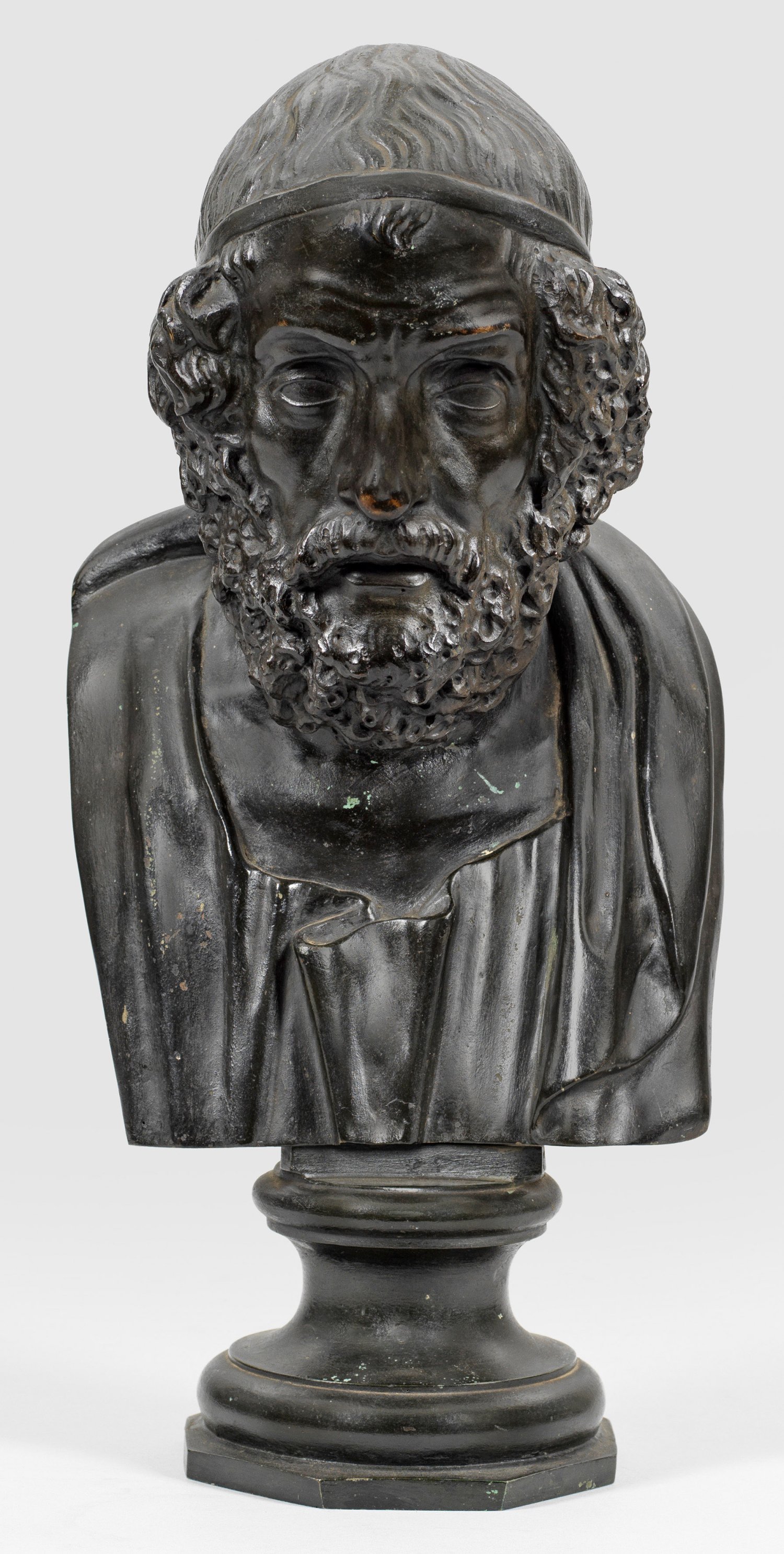 Bronze, dunkel patiniert. Grand Tour-Objekt. Auf eine runde, unterhalb achteckige Säulenplinthe komponierte, vollplastische Büste des bedeutenden griechischen Dichters Homer als blinder Greis, wohl nach einem hellenistischen Vorbild. H. 40,5 cm.