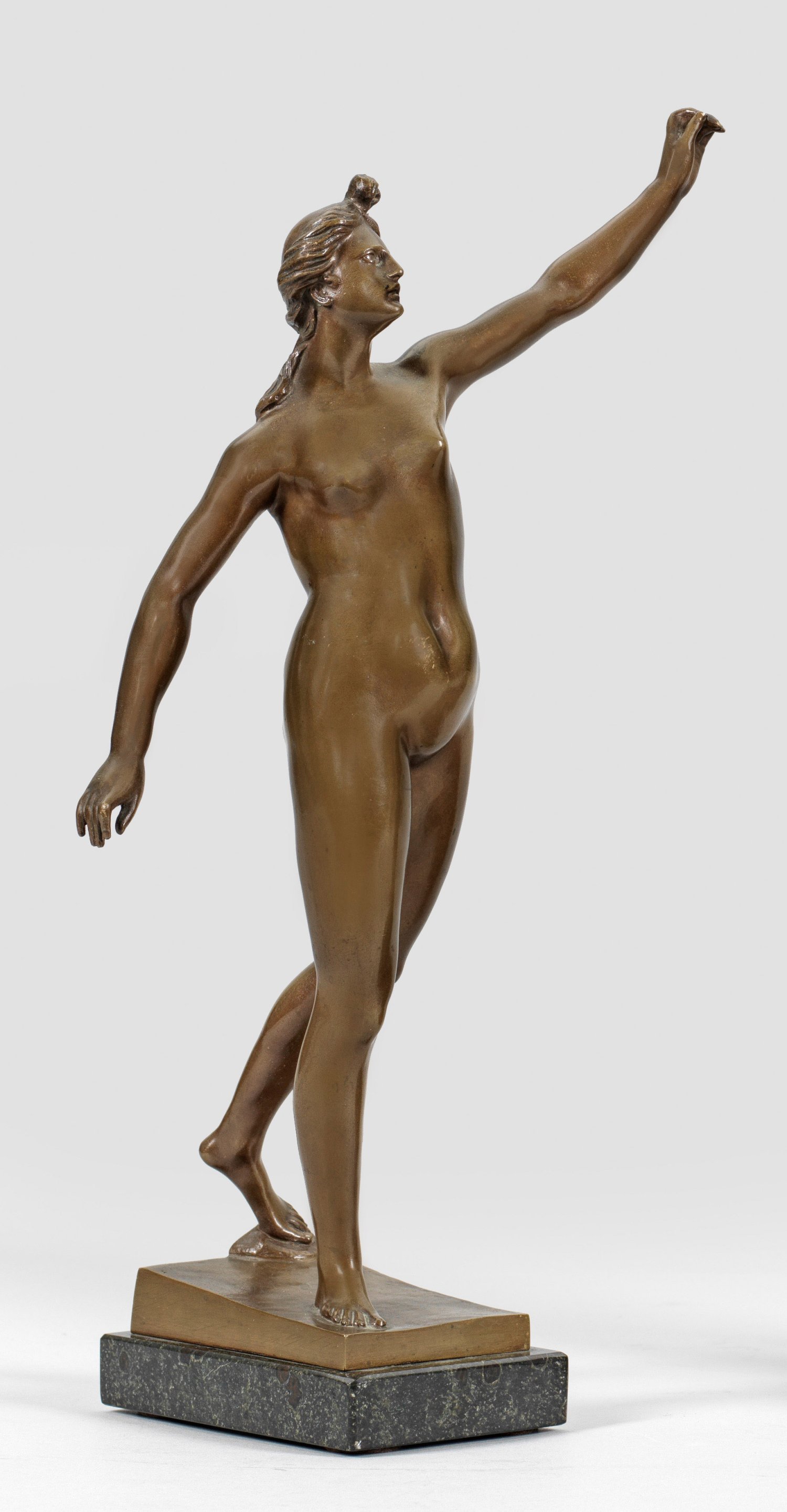 Bronze, goldbraun patiniert. Gießerstempel "Akt.-Ges: v. H. Gladenbeck & Sohn.". Serpentinsockel. Allegorische Darstellung eines anmutig schreitenden, weiblichen Aktes. H. 36 cm.