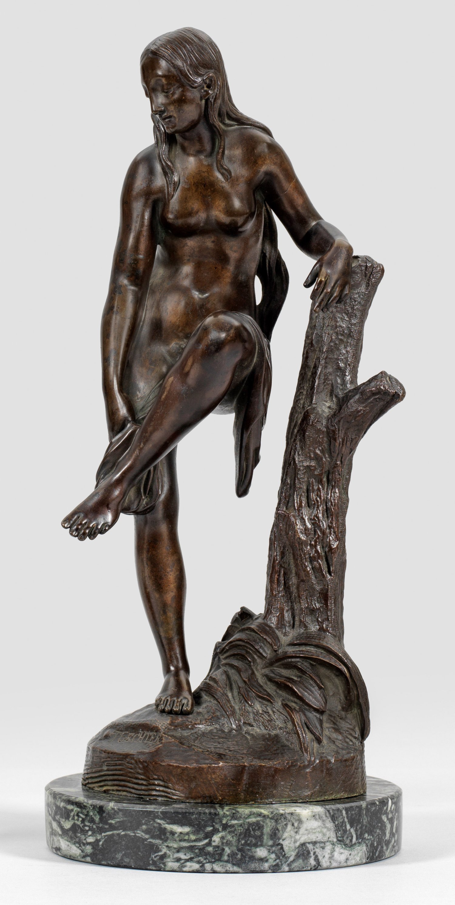 Bronze, dunkelbraun patiniert. Sign.; Runder Serpentinsockel. Sich auf einen Baumstamm stützende junge Frau mit zur Seite gesenktem Blick und sich mit einem Tuch abtrocknend. Auf naturalistisch gestaltetem Stand feine, in sich ruhende Aktdarstellung. H. 39,5 cm.