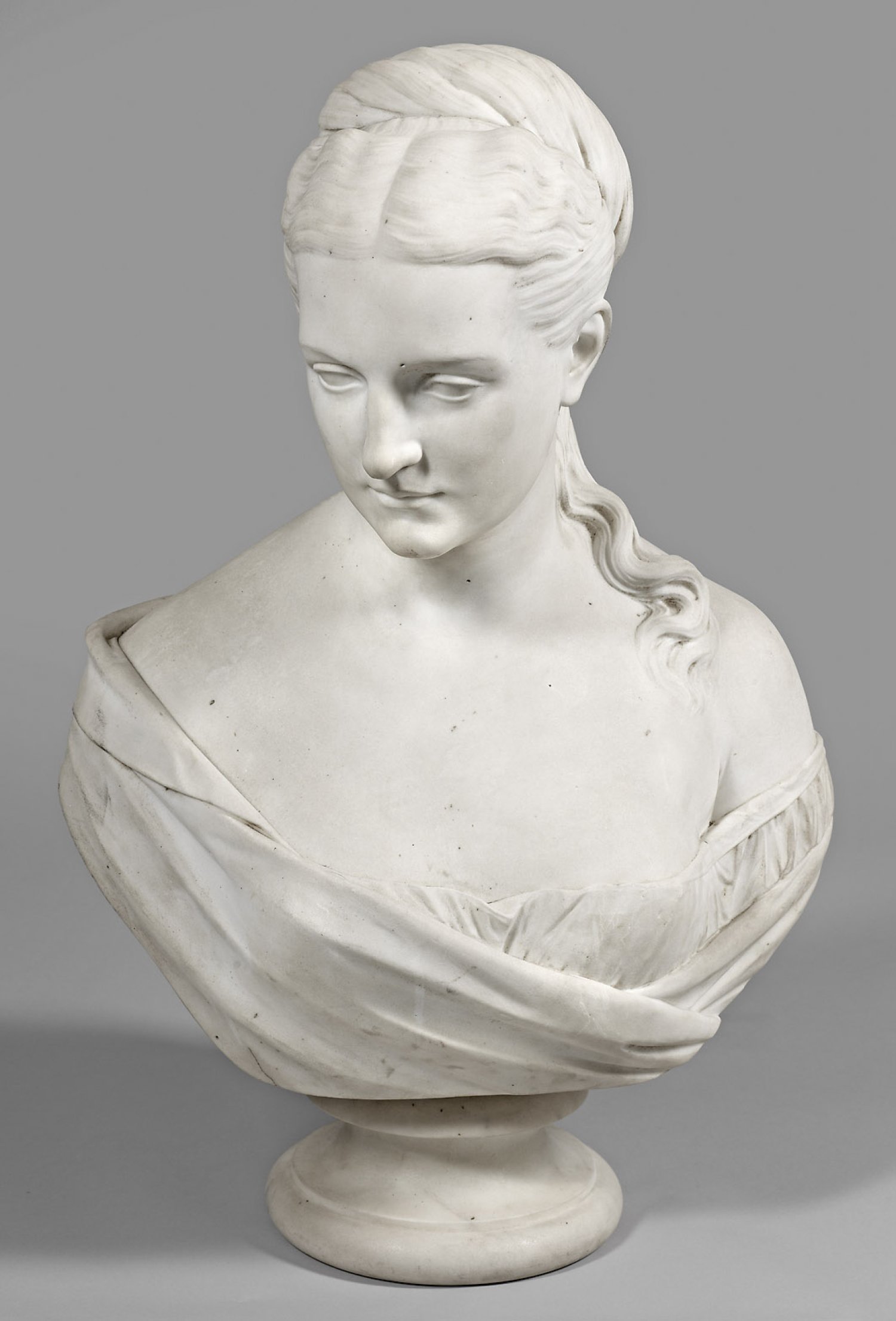 Weißer Carrara-Marmor. Sign. u. dat. 1873. Lebensgroße, bildhauerisch fein und qualitätvoll ausgeführte Büste des seit 1849 in London ansässigen Bildhauers. Dort erwarb er sich mit Portrait-Statuen und -Büsten u. a. des Königspaares und Charles Dickens' einen bedeutenden Ruf; 1852 bis 1886 stellte er in der Royal Academy aus. H. 74 cm.