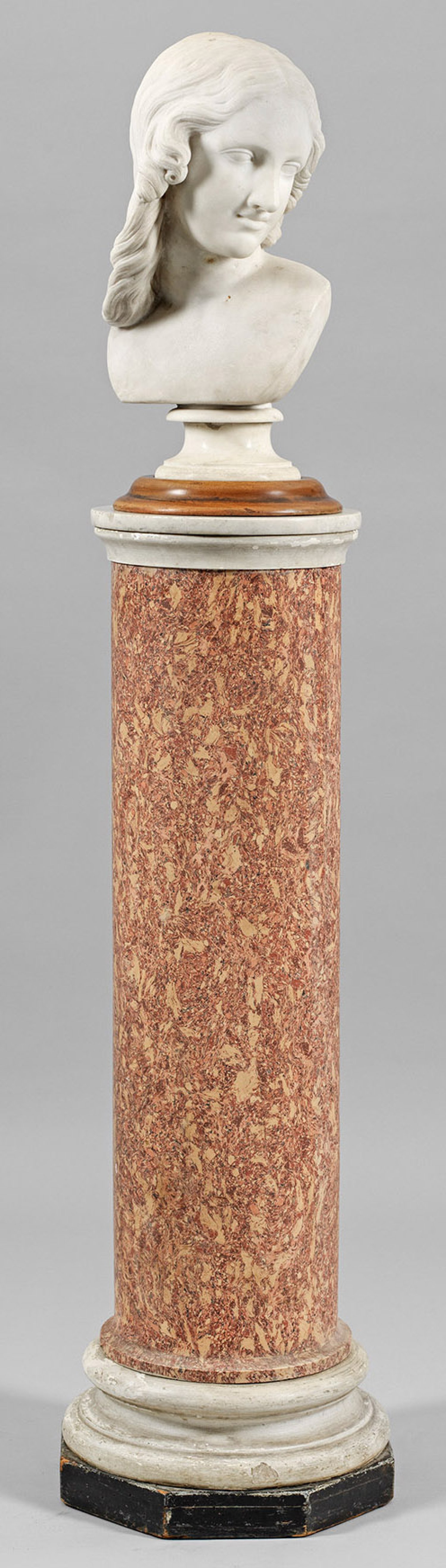 Weißer Marmor. Auf eine Säulenplinthe komponierte Büste einer jungen Frau im Profil, ihren Kopf nach links wendend und den gedankenverlorenen Blick leicht nach unten gerichtet. Künstlerisch qualitätvolle, subtil ausgeführte Skulptur, die stilistisch auf die Berliner Bildhauerschule des 19. Jhs. schließen lässt. Hohes Säulenpostament aus ebonisiertem Holz, Stuckmarmor und weißgrauer Marmor-Deckplatte, die Büste einsetzbar in eine gesonderte Nussbaumplinthe. Büsten-H. ca. 49 cm.; Säule mit Extraplinthe. H. ca. 114,5 cm.