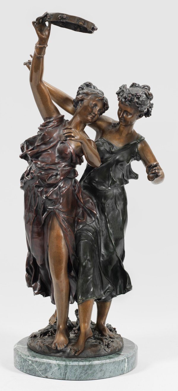 Bronze, goldbraun und dunkel patiniert. Bez.; Posthumer, zeitgenössischer Guss des 20./21. Jhs.; Dunkelgrüner Marmorsockel. Auf einer runden, mit Weinreben belegten Pinthe stehende, ausgelassene Bacchantinnen in tanzender Pose mit Tamburin und Castagnetten. Der Bildhauer François Mage war ein Schüler von François Rude und stellte 1861-1875 mehrfach auf dem Salon in Paris aus. Seine Figuren zeigen romantische, allegorische und klassische Motive. Ges.-H. 65 cm
