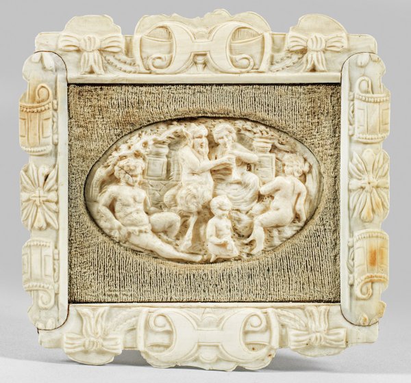 Elfenbein, geschnitzt. Querovale szenische Darstellung mit Pan, Schalmeispielerin, Nymphe, Amor und Faun in bewachsener Parkkulisse. Samt-Rahmung allseitig eingefasst von Friesleisten mit Rollwerk, Rosetten und Festons. 11,1 cm x 11,3 cm. CITES-Bescheinigung liegt vor.