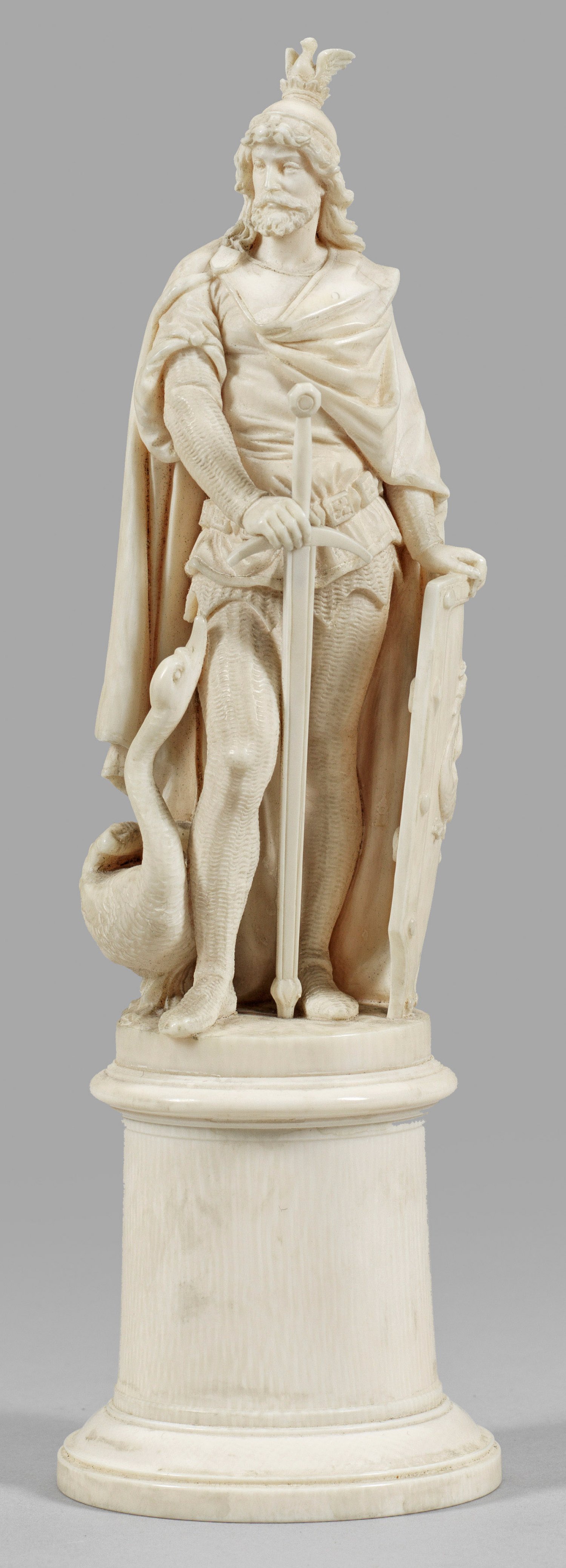 Elfenbein, geschnitzt. Vollplastische, im Detail sehr fein und minutiös ausgeführte Statuette des Helden und Gralsritters aus der mittelhochdeutschen Schwanenrittersage aus dem 12./13. Jh. (u. a. beim Wolfram von Eschenbach im Parzival-Epos), der durch die romantische Oper "Lohengrin" von Richard Wagner seit 1850 große Popularität erlangte. H. 21,5 cm. CITES-Bescheinigung liegt vor.