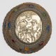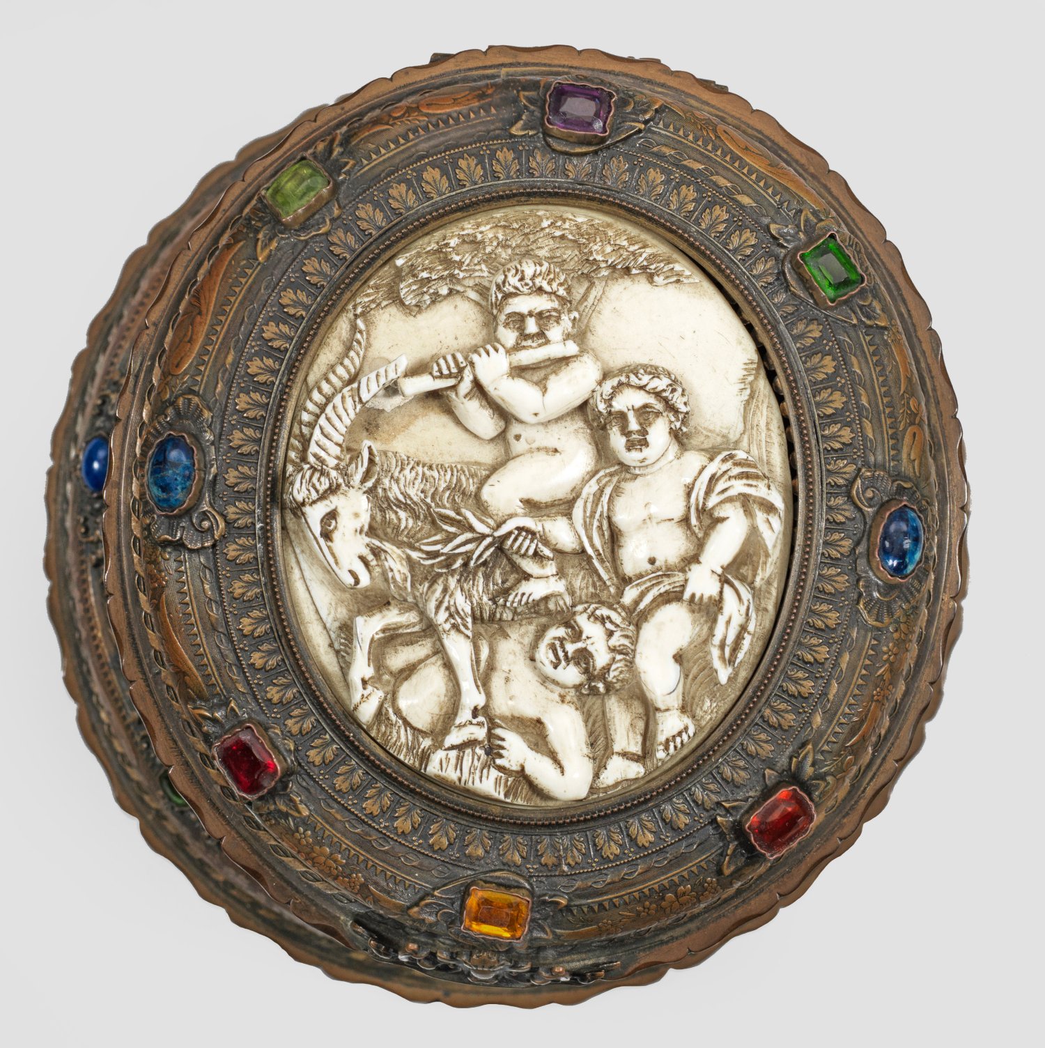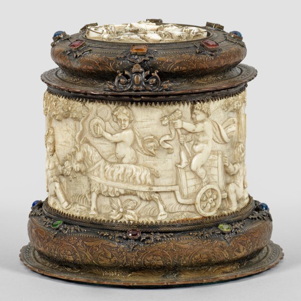 Messing und Elfenbein, geschnitzt. Runder Stand, in gering ovoide Wandung übergehend. Passig geschweifter, gekehlter und wulstartig aufgewölbter Standring sowie korrespondierend gestalteter Scharnierdeckel, besetzt mit gefassten gelben, roten, blauen und grünen Schmucksteinen und umzogen von Blatt- und Blütenranken. Die Wandung umzogen von fein geschnitztem Elfenbeinrelief. Darauf dargestellt eine ausgelassene Szene mit Bacchantenzug, einem Satyr einen Ziegenbock festhaltend und spielende und musizierende Putti vor bewaldeter Landschaft. Im Deckel ein ovales, gefasstes Medaillon ebenfalls mit mehreren Putti auf einem Ziegenbock reitend. Teilw. mit Restvergoldung. H. 14,5 cm. Stand-D. 17 cm. Rand: 13 cm x 14,5 cm. CITES-Bescheinigung liegt vor.
