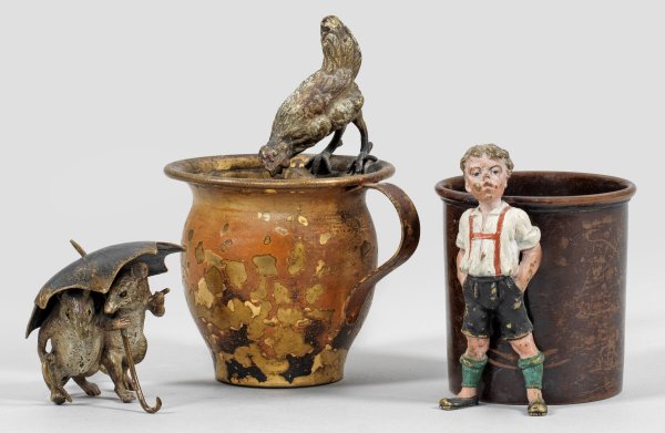 Bronze und Messing, farbig gefasst bzw. dunkel patiniert. Darstellung eines Mäusepaares unter Regenschirm, ein Henkelbecher mit Huhn auf dem Rand sowie ein Becher mit einem Jungen in Lederhosen als Griff. Der Junge mit sog. Krugmarke und Modell-Nr. H. 6 cm - 11,7 cm.