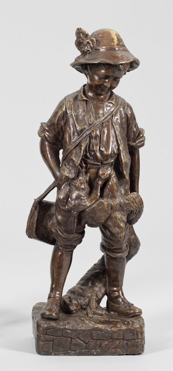 Bronze, braun patiniert. Undeutl. sign.; Detailreich ausgeführte Figur. Auf einer rechteckigen, felsenartig reliefierten Plinthe stehender Knabe in lässiger Pose und mit zufrieden gesenktem Blick, über die linke Schulter eine umgehängte Jagdtasche, mit seiner rechten Hand ein erbeutetes Kaninchen (oder einen Hasen) haltend, vor seinem Bauch zwei angebundene Wildvögel. H. 53 cm.