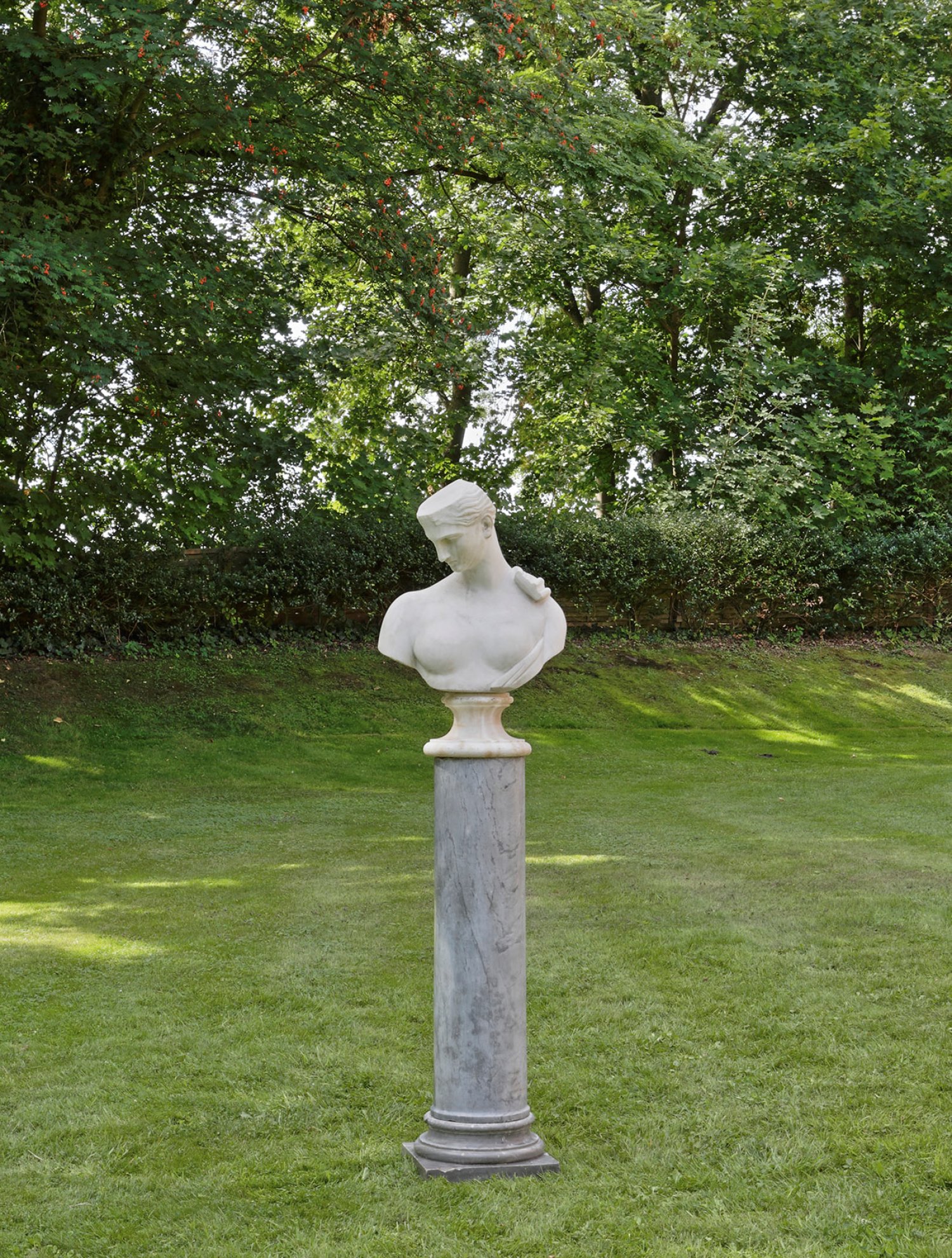 Heller, weißgrauer Stein. Auf eine Säulenplinthe komponierte, in moderner Weise torsohaft verfremdete Büste einer jungen Frau mit nach rechts in Profil gewandtem Kopf und nach unten gerichtetem Blick. Hoher Säulenpostamentsockel aus hellgrauem Marmor, ger. best.; Büsten-H. ca. 69 cm; Säulen-H. ca. 105 cm.