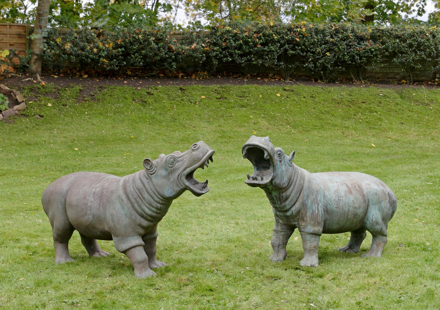 Gegenstücke. Bronze, patiniert. Vollplastische, monumentale, dekorative Parkfiguren mit der Darstellung von Flusspferden, die erhobenen Köpfe mit geöffnetem Maul. H. ca. 92-94 cm; L. ca. 140 cm-145 cm.
