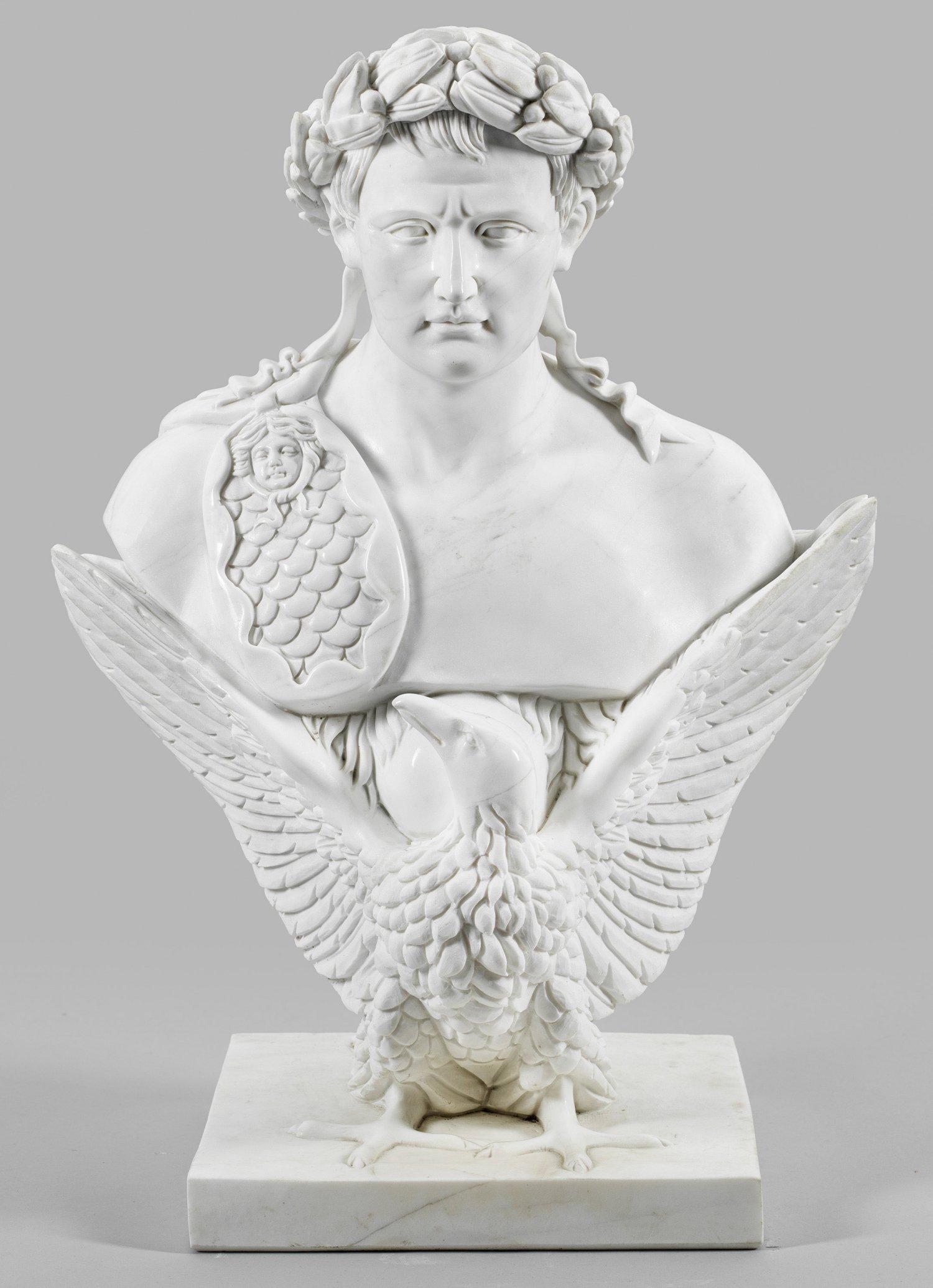 Weißer Marmor. Auf rechteckiger Pinthe ein Adler mit ausgebreiteten Schwingen, die mit Lorbeerkranz bekrönte Büste des französischen Kaisers tragend. Posthume, zeitgenössische Skulptur (Ende 20./Anfang 21. Jh.) nach der 1829 von Thorvaldsen ausgeführten Büste Napoleons, welche sich im Bertel Thorvaldsen Museum in Kopenhagen befindet. H. 60 cm.