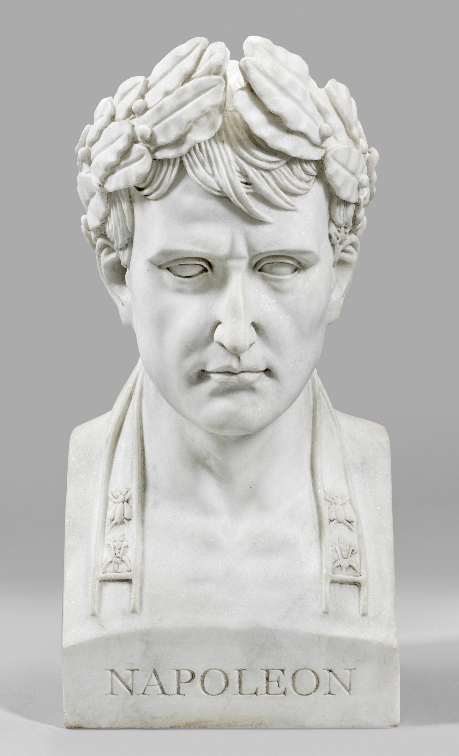 Weißer Marmor. Posthume, zeitgenössische Skulptur (Ende 20./Anfang 21. Jh.) nach der bekannten Büste Napoleons mit Lorbeerkranz, die Canova 1804 ausführte. Auf dem Sockel bez.; H. 60,5 cm.