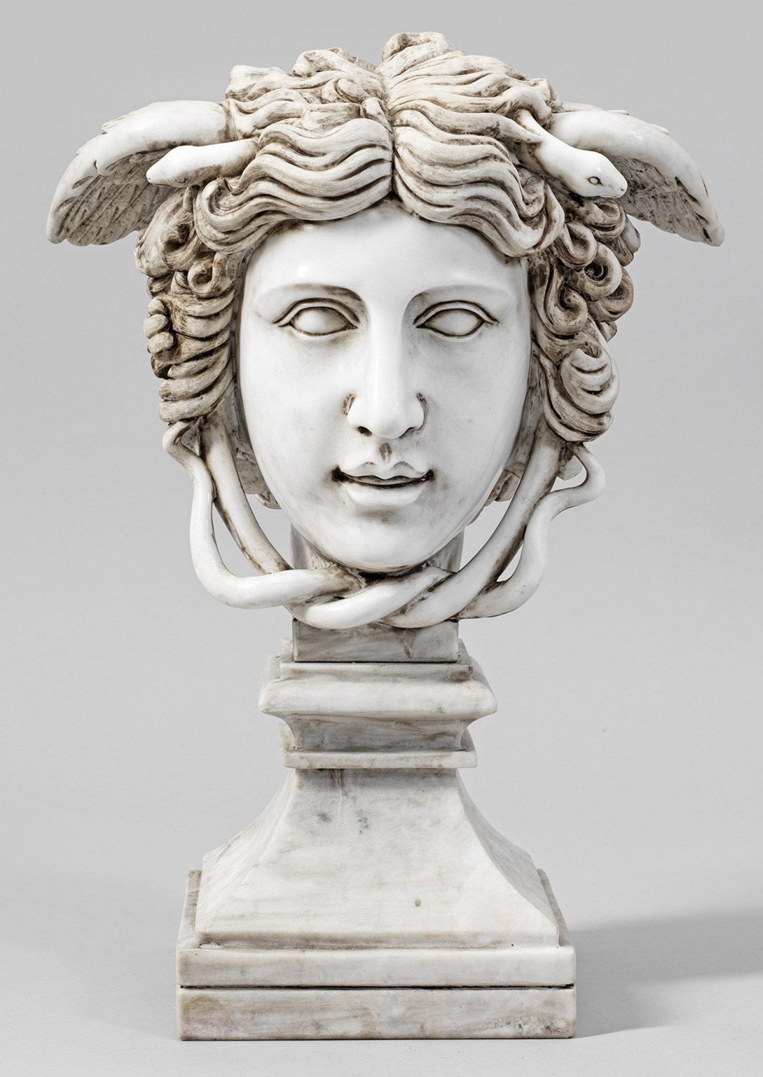 Weißer Marmor. Vollplastisch gearbeitetes Haupt mit Flügeln im Haar und zwei Schlangen, die den Kopf umfangen und sich vom Kinn bis in das Haar winden. Die Darstellung basiert auf der berühmten antiken römischen Skulptur, die als Rondanini Medusa bekannt ist und dem 1764 in Rom entstandenen bekannten Medusenkopf des englischen Bildhauers Joseph Nollekens, der sich heute in den Burghley House collections in Stamford befindet. H. 58 cm.