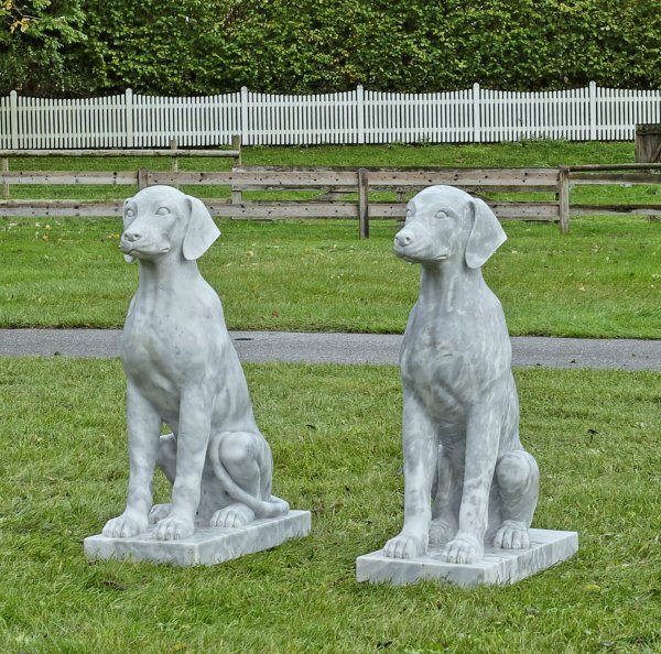 Gegenstücke. Weißer, hellgrau gemaserter Marmor. Über rechteckiger Plinthe vollplastische, naturgetreu geschilderte Darstellung von jungen, aufwartenden Jagdhunden mit stolz erhobenem Haupt als Portalfiguren. H. 92 cm.