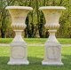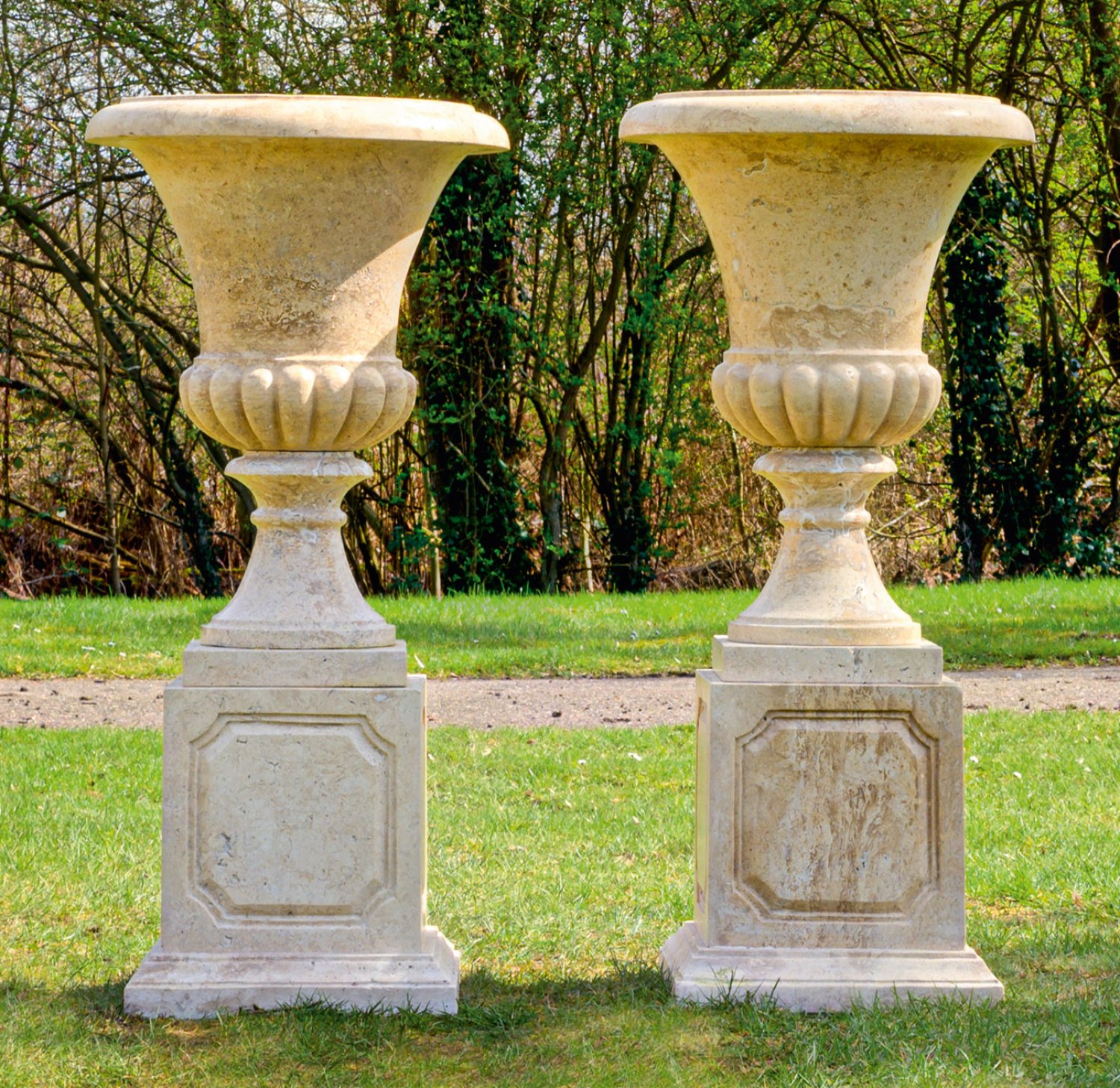 Cremefarben gemaserter Travertin. Über profilierter Basis rechteckiger Korpus mit profilierten Füllungen als Träger für große, teilw. godronierte Kratervasen mit weit ausschwingendem Lippenrand. Ges.-H. 127 cm.