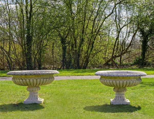 Weißer, hellgrau gemaserter Marmor. Über quadratischer Plinthe, kurzer, konisch eingezogener Schaft mit Zungenfries als Träger für weit ausladende, flach gemuldete und umlaufend godronierte Schale mit breitem Lippenrand aus Eierstabfries. H. 62 cm. D. 105 cm.