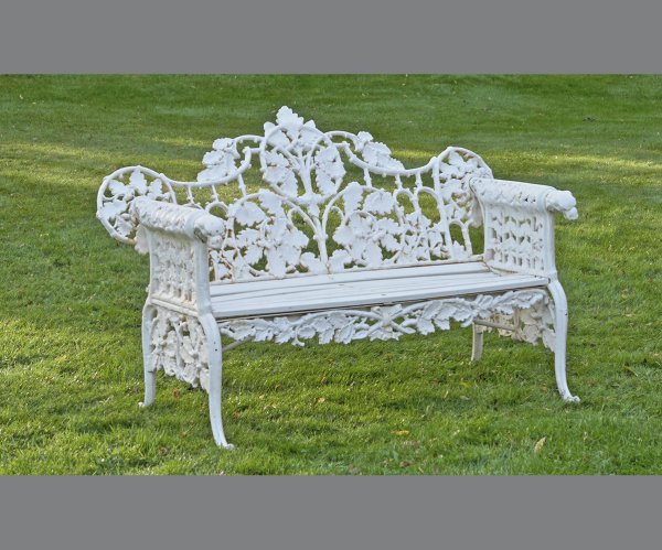 Gusseisen und Holz, weiß lackiert. Durchbrochen gearbeitete Zarge auf schlanken Volutenbeinen. Gerundete Armlehnen mit vollplastisch gestalteten Löwenköpfen. Stark geschwungene, durchbrochen gearbeitete Rückenlehnenrahmung aus üppigen Blattvoluten mit Eichenlaub und hochgewölbtem oberen Abschluss. H. 96 cm. 150 cm x 64 cm. Sitz-H. 43 cm.