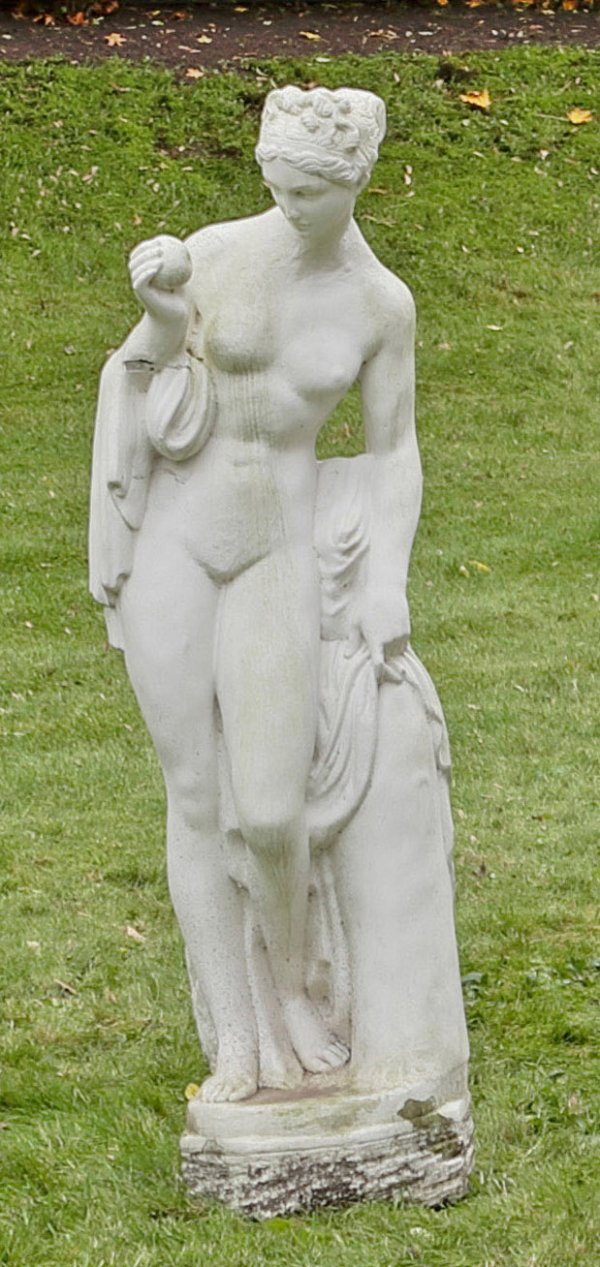 An Italian garden sculpture of a bathing female nude with an apple. White painted stone cast. Flaws to the right underarm.