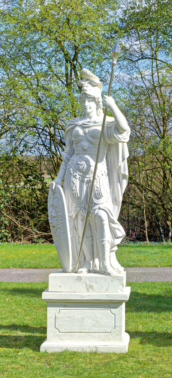 Weißgrauer Marmor. Vollplastische, detailreiche, neoklassizistische Darstellung der römischen Göttin der Weisheit, der Gerechtigkeit, des Gesetzes, des Sieges und strategischen Krieges, des Handels, Förderin der Künstler, Handwerker, Dichter und Lehrer. Minerva wird in leichtem Kontrapost stehend und in voller Rüstung dargestellt, mit Aigis (Brustpanzer) und Helm, mit der rechten Hand ein Schild haltend, die linke Hand für einen Speer (bzw. eine Lanze) erhoben. Plinthe ger. best.; Skulpturen-H. ca. 208 cm; Sockel-H. ca. 55 cm; Ges.-H. ca. 263 cm.