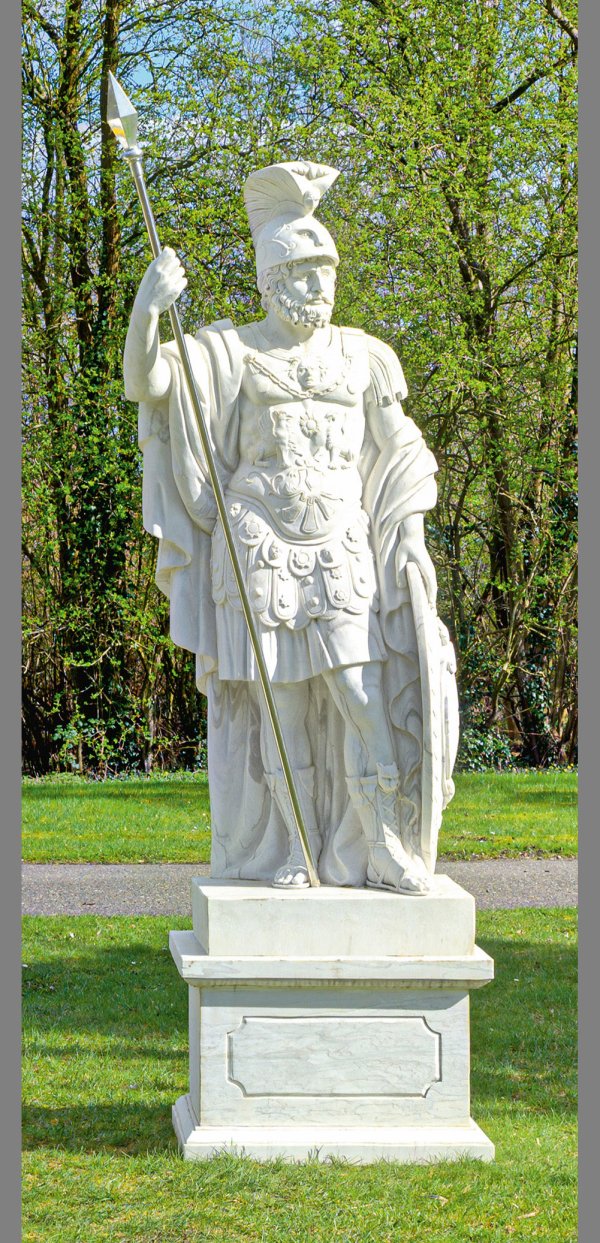 Weißgrauer Marmor. Der römische Kriegsgott wird in voller Rüstung dargestellt, er trägt einen Muskelpanzer mit Pteryges, Mantel, Beinschienen und einen reich verzierten Helm, hält mit der linken Hand ein Schild, die rechte Hand erhoben für einen Speer. Vollplastische, große Skulptur nach dem berühmten, monumentalen, römischen Original, ausgestellt in den Kapitolinischen Museen in Rom (Inv.-Nr. 58). Diese stammt höchstwahrscheinlich aus dem frühen 2. Jh. n. Chr. und wurde im 16. Jh. in den Ruinen des Nerva-Forums (auch Forum Transitorium) in Rom gefunden. 1738 erwarb Papst Clemens XII. die Skulptur, ließ sie ergänzen, so dass sie seit 1740 in den Museen ausgestellt ist. Helm ger. best.; Skulpturen-H. ca. 208 cm; Sockel-H. ca. 55 cm; Ges.-H. ca. 263 cm.